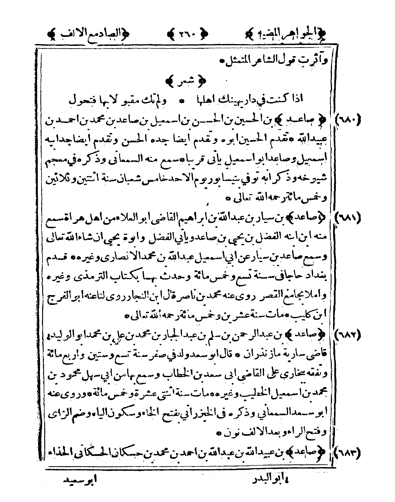 682 - صاعد بن عبد الرَّحْمَن بن سلم بن عبد الْجَبَّار بن مُحَمَّد بن عَليّ بن مُحَمَّد أَبُو الْوَلِيد قَاضِي سَارِيَة مازنذران قَالَ أَبُو سعد ولد فى صفر سنة تسع وَسِتِّينَ وَأَرْبع مائَة وتفقه ببخارى على القَاضِي أبي سعد بن الْخطاب وَسمع بهَا من أبي سهل مَحْمُود بن مُحَمَّد بن إِسْمَعِيل الْخَطِيب وَغَيره مَاتَ سنة اثنتى عشرَة وَخمْس مائَة وروى عَنهُ أَبُو سعد السَّمْعَانِيّ وَذكره فى الخيزراني بِفَتْح الْخَاء وَسُكُون الْيَاء وَضم الزَّاي وَفتح الرَّاء وَبعد الْألف نون