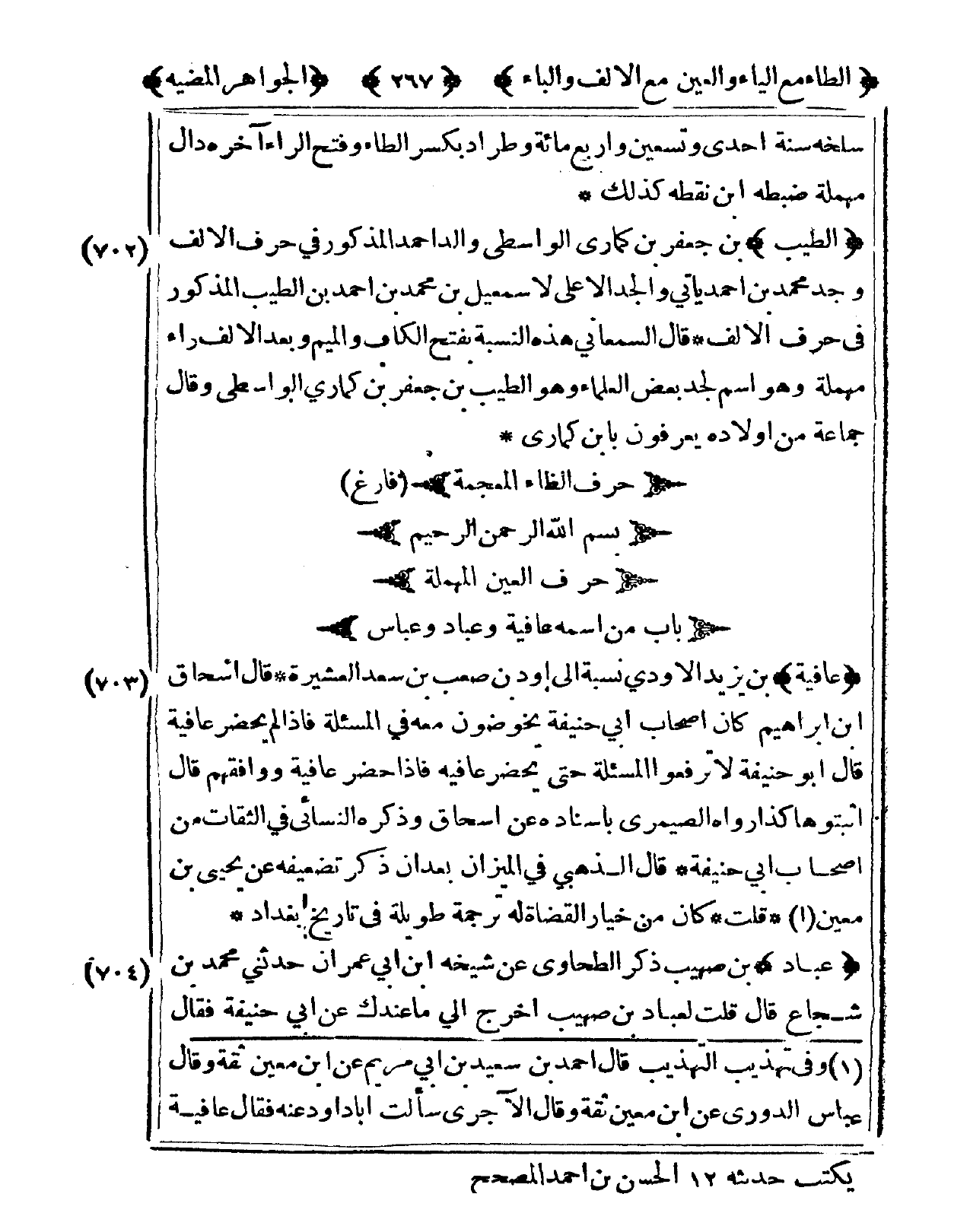 703 - عَافِيَة بن يزِيد الأودي نِسْبَة إِلَى أود بن صَعب بن سعد الْعَشِيرَة قَالَ إِسْحَاق ابْن إِبْرَاهِيم كَانَ أَصْحَاب أبي حنيفَة يَخُوضُونَ مَعَه فى المسئلة فَإِذا لم يحضر عَافِيَة قَالَ أَبُو حنيفَة لَا تَرفعُوا المسئلة حَتَّى يحضر عَافِيَة فَإِذا حضر عَافِيَة وَوَافَقَهُمْ قَالَ أثبتوها كَذَا رَوَاهُ الصَّيْمَرِيّ بِإِسْنَادِهِ عَن إِسْحَاق وَذكره النَّسَائِيّ فى الثِّقَات من أَصْحَاب أبي حنيفَة قَالَ الذَّهَبِيّ فى الْمِيزَان بعد أَن ذكر تَضْعِيفه عَن يحيى بن معِين قلت كَانَ من خِيَار الْقُضَاة لَهُ تَرْجَمَة طَوِيلَة فى تَارِيخ بَغْدَاد
