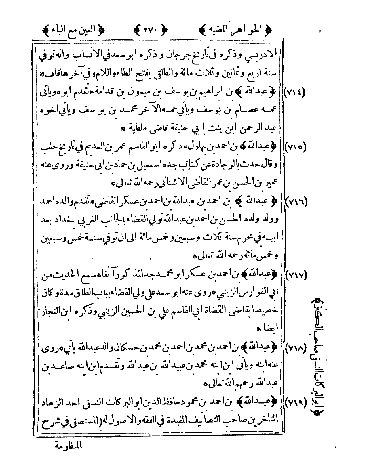 719 - عبد الله بن أَحْمد بن مَحْمُود حَافظ الدّين أَبُو البركات النَّسَفِيّ أحد الزهاد الْمُتَأَخِّرين صَاحب التصانيف المفيدة فى الْفِقْه وَالْأُصُول لَهُ الْمُسْتَصْفى فى شرح