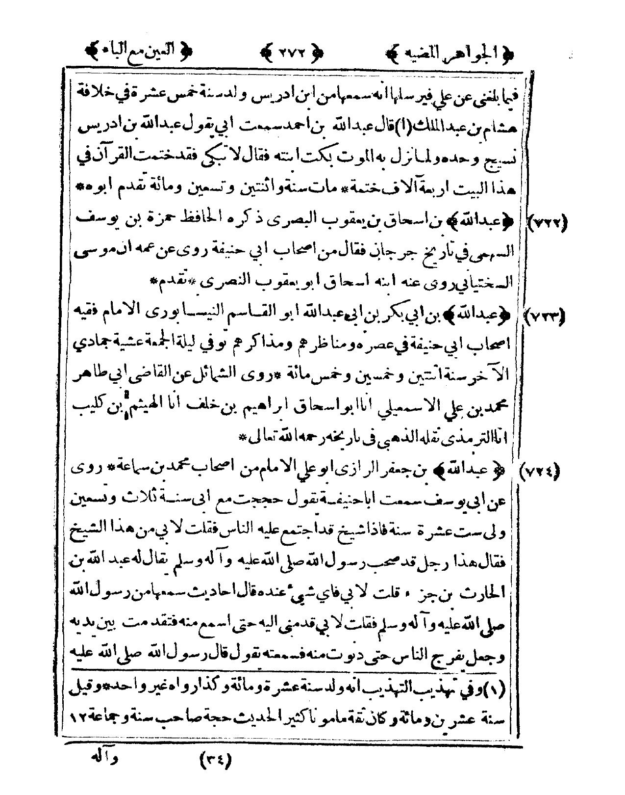 724 - عبد الله بن جَعْفَر الرَّازِيّ أبوعلي الإِمَام من أَصْحَاب مُحَمَّد بن سَمَّاعَة روى عَن أبي يُوسُف سَمِعت أَبَا حنيفَة يَقُول حججْت مَعَ أبي سنة ثَلَاث وَتِسْعين ولي سِتّ عشرَة سنة فَإِذا شيخ قد اجْتمع عَلَيْهِ النَّاس فَقلت لأبي من هَذَا الشَّيْخ فَقَالَ هَذَا رجل قد صحب رَسُول الله صلى الله عَلَيْهِ وَسلم يُقَال لَهُ عبد الله بن الْحَارِث بن جُزْء قلت لأبي فَأَي شَيْء عِنْده قَالَ أَحَادِيث سَمعهَا من رَسُول الله صلى الله عَلَيْهِ وَسلم فَقلت لأبي قدمني إِلَيْهِ حَتَّى اسْمَع مِنْهُ فتقدمت بَين يَدَيْهِ وَجعل يفرج النَّاس حَتَّى دَنَوْت مِنْهُ فَسَمعته يَقُول قَالَ رَسُول الله صلى الله عَلَيْهِ
