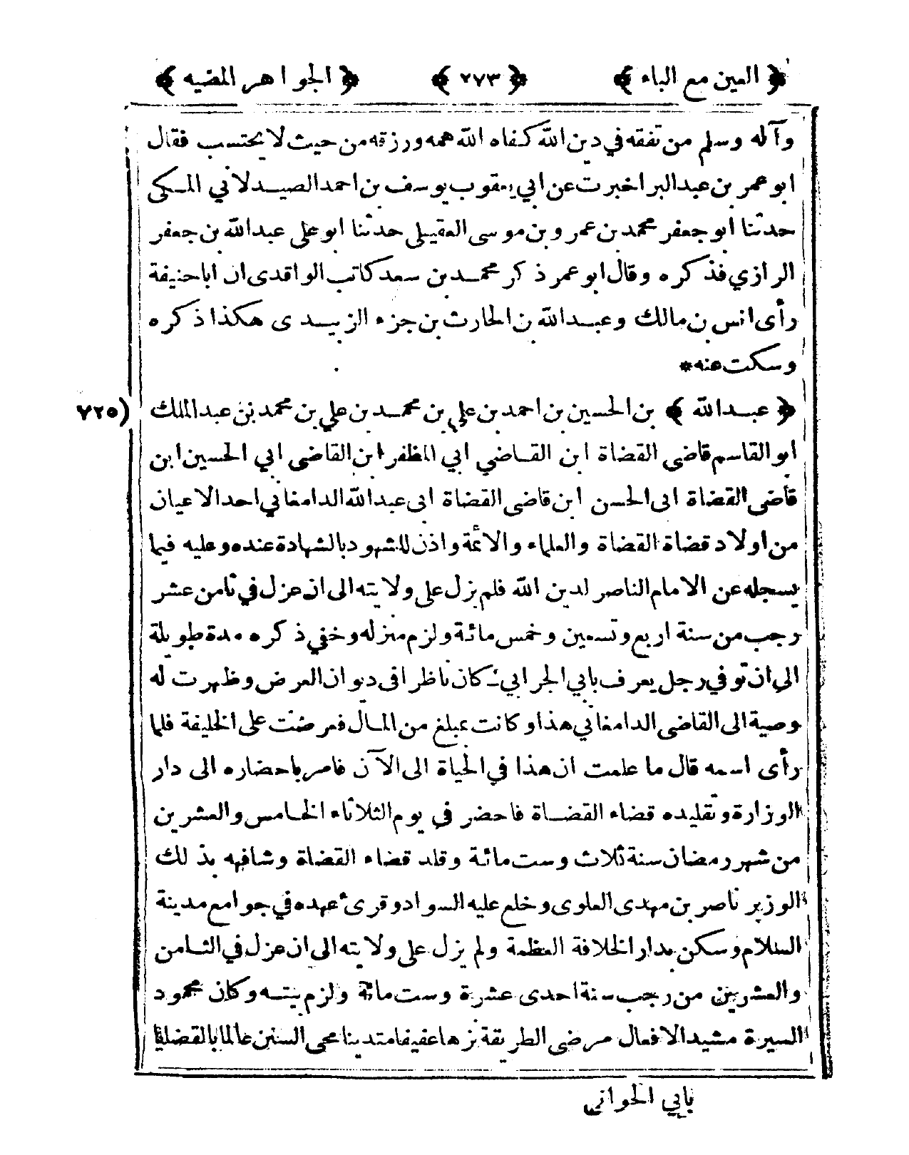 725 - عبد الله بن الْحُسَيْن بن أَحْمد بن عَليّ بن مُحَمَّد بن عَليّ بن مُحَمَّد بن عبد الْملك أَبُو الْقَاسِم قَاضِي الْقُضَاة ابْن القَاضِي أبي المظفر ابْن القَاضِي أبي الْحُسَيْن ابْن قَاضِي الْقُضَاة أبي الْحسن ابْن قَاضِي الْقُضَاة أبي عبد الله الدَّامغَانِي أحد الْأَعْيَان من أَوْلَاد قُضَاة الْقُضَاة وَالْعُلَمَاء وَالْأَئِمَّة وَأذن للشُّهُود بِالشَّهَادَةِ عِنْده وَعَلِيهِ فِيمَا يسجله عَن الإِمَام النَّاصِر لدين الله فَلم يزل على ولَايَته إِلَى أَن عزل فى ثامن عشر رَجَب من سنة أَربع وَتِسْعين وَخمْس مائَة وَلزِمَ منزله وخفي ذكره مُدَّة طَوِيلَة إِلَى أَن توفّي رجل يعرف بِأبي الجرابي كَانَ نَاظرا فى ديوَان الْعرض وَظَهَرت لَهُ وَصِيَّة إِلَى القَاضِي الدَّامغَانِي هَذَا وَكَانَت بمبلغ من المَال فعرضت على الْخَلِيفَة فَلَمَّا رَأْي اسْمه قَالَ مَا علمت أَن هَذَا فى الْحَيَاة إِلَى الْآن فَأمر بإحضاره إِلَى دَار الوزارة وتقليده قَضَاء الْقُضَاة فأحضر فى يَوْم الثُّلَاثَاء الْخَامِس وَالْعِشْرين من شهر رَمَضَان سنة ثَلَاث وست مائَة وقلد قَضَاء الْقُضَاة وشافهه بذلك الْوَزير نَاصِر بن مهْدي الْعلوِي وخلع عَلَيْهِ السوَاد وَقُرِئَ عَهده فى جَوَامِع مَدِينَة السَّلَام وَسكن بدار الْخلَافَة العظمة وَلم يزل على ولَايَته إِلَى أَن عزل فى الثَّامِن وَالْعِشْرين من رَجَب سنة إِحْدَى عشرَة وست مائَة وَلزِمَ بَيته وَكَانَ مَحْمُود السِّيرَة مشيد الْأَفْعَال مرضِي الطَّرِيقَة نزها عفيفا متدينا مُحي السّنَن عَالما بالقضايا
