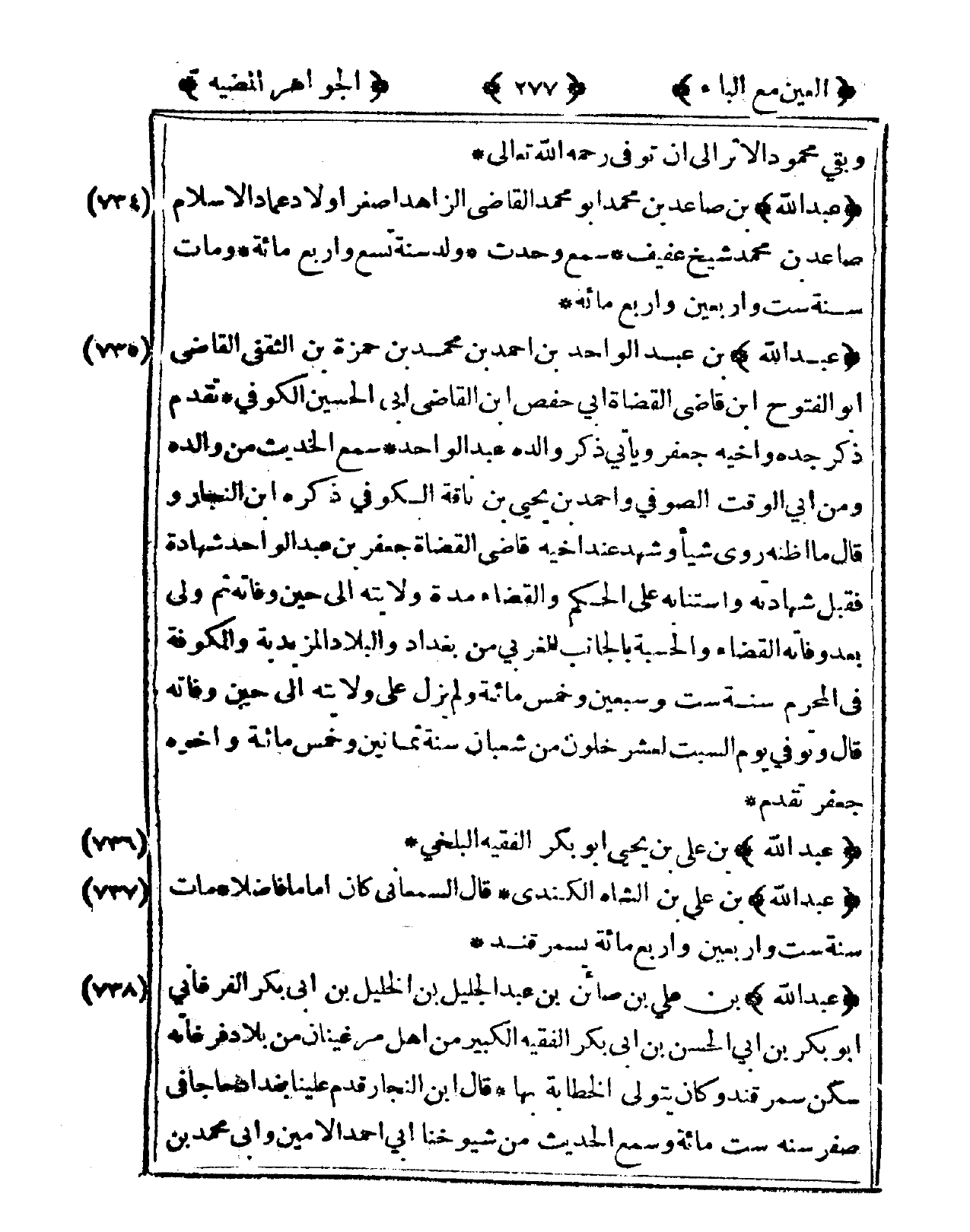 737 - عبد الله بن عَليّ بن الشاه الكدني قَالَ السَّمْعَانِيّ كَانَ إِمَامًا فَاضلا مَاتَ سنة سِتّ وَأَرْبَعين وَأَرْبع مائَة بسمرقند