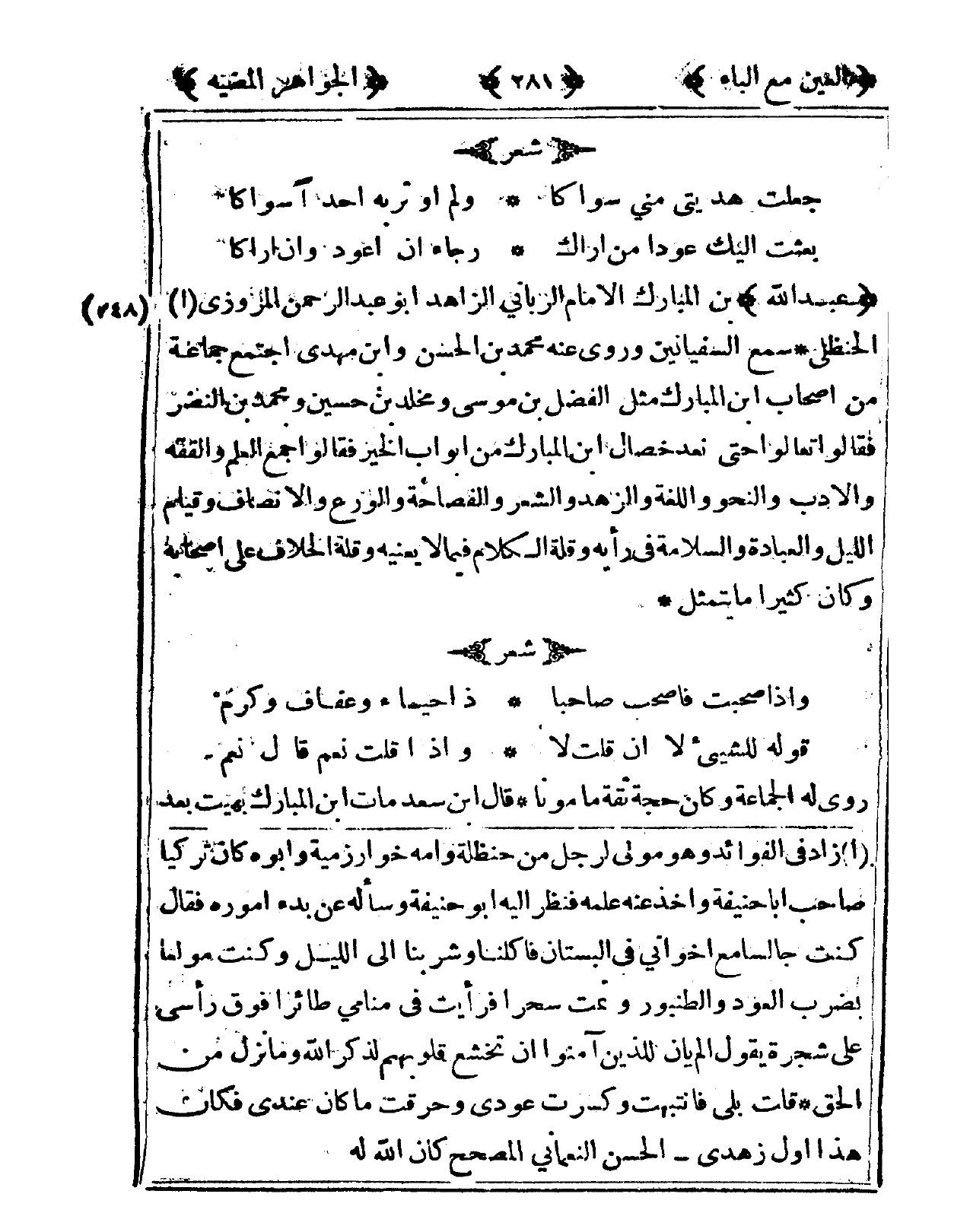 748 - عبد الله بن الْمُبَارك الإِمَام الرباني الزَّاهِد أَبُو عبد الرَّحْمَن الْمروزِي الْحَنْظَلِي سمع السفيانين وروى عَنهُ مُحَمَّد بن الْحسن وَابْن مهْدي اجْتمع جمَاعَة من أَصْحَاب ابْن الْمُبَارك مثل الْفضل بن مُوسَى ومخلد بن حُسَيْن وَمُحَمّد بن النَّضر فَقَالُوا تَعَالَوْا حَتَّى نعد خِصَال ابْن الْمُبَارك من أَبْوَاب الْخَيْر فَقَالُوا جمع الْعلم وَالْفِقْه وَالْأَدب والنحو واللغة والزهد وَالشعر والفصاحة والورع والإنصاف وَقيام اللَّيْل وَالْعِبَادَة والسلامة فى رَأْيه وَقلة الْكَلَام فِيمَا لَا يعنيه وَقلة الْخلاف على أَصْحَابه وَكَانَ كثيرا مَا يتَمَثَّل شعر ... وَإِذا صَحِبت فاصحب صاحبا ... ذَا حَيَاء وعفاف وكرم