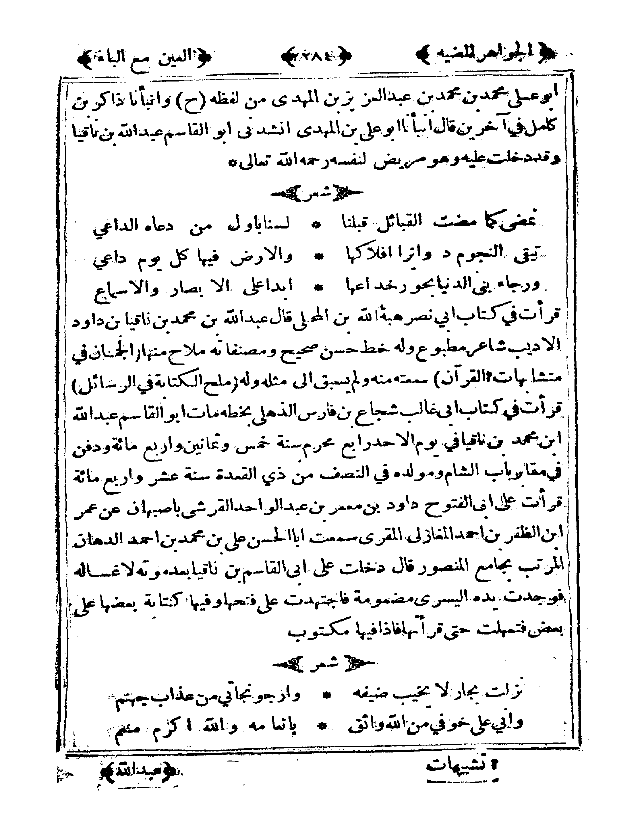 أَبُو عَليّ مُحَمَّد بن مُحَمَّد بن عبد الْعَزِيز الْمهْدي من لَفظه ح وأنبأنا ذَاكر بن كَامِل فى آخَرين قَالَ أَنبأَنَا أَبُو عَليّ بن الْمهْدي أَنْشدني أَبُو الْقَاسِم عبد الله بن ناقيا وَقد دخلت عَلَيْهِ وَهُوَ مَرِيض لنَفسِهِ رَحمَه الله تَعَالَى شعر ... نمضي كَمَا مَضَت الْقَبَائِل قبلنَا ... لسنا بِأول من دَعَاهُ الدَّاعِي