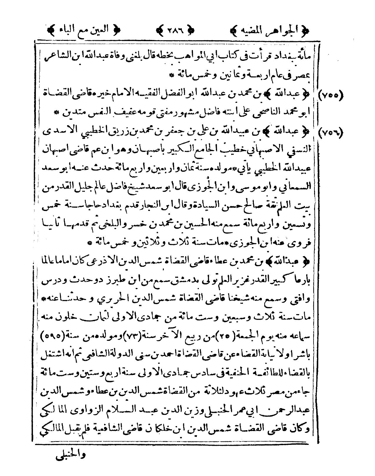 755 - عبد الله بن مُحَمَّد بن عبد الله أَبُو الْفضل الْفَقِيه الإِمَام خَيره قَاضِي الْقُضَاة أَبُو مُحَمَّد الناصحي على ابْنَته فَاضل مَشْهُور مفتي قومه عفيف النَّفس متدين
