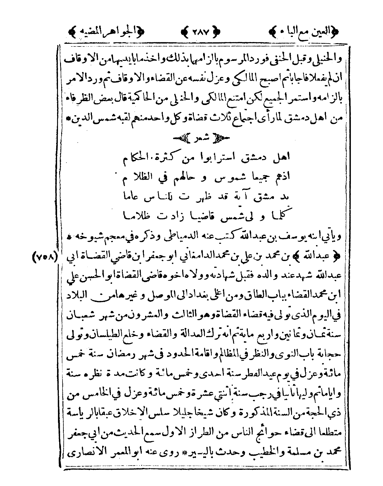 758 - عبد الله بن مُحَمَّد بن عَليّ بن مُحَمَّد الدَّامغَانِي أَبُو جَعْفَر ابْن قَاضِي الْقُضَاة أبي عبد الله شهد عِنْد وَالِده فَقبل شَهَادَته وولاه أَخُوهُ قَاضِي الْقُضَاة أَبُو الْحسن عَليّ ابْن مُحَمَّد الْقَضَاء بِبَاب الطاق وَمن أَعلَى بَغْدَاد إِلَى الْموصل وَغَيرهَا من الْبِلَاد فى الْيَوْم الذى تولى فِيهِ قَضَاء الْقُضَاة وَهُوَ الثَّالِث وَالْعشْرُونَ من شهر شعْبَان سنة ثَمَان وَثَمَانِينَ وَأَرْبع ماية ثمَّ أَنه ترك الْعَدَالَة وَالْقَضَاء وخلع الطيلسان وَتَوَلَّى حجابة بَاب النَّوَى وَالنَّظَر فى الْمَظَالِم وَإِقَامَة الْحُدُود فى شهر رَمَضَان سنة خمس مائَة وعزل فى يَوْم عيد الْفطر سنة إِحْدَى وَخمْس مائَة وَكَانَت مُدَّة نظره سنة وأياما ثمَّ وَليهَا ثَانِيًا فى رَجَب سنه اثْنَتَيْ عشرَة وَخمْس مائَة وعزل فى الْخَامِس من ذِي الْحجَّة من السّنة الْمَذْكُورَة وَكَانَ شَيخا جَلِيلًا سَلس الْأَخْلَاق عبقا بالرياسة متطلعا إِلَى قَضَاء حوائج النَّاس من الطّراز الأول سمع الحَدِيث من أبي جَعْفَر مُحَمَّد بن مسلمة والخطيب وَحدث باليسير روى عَنهُ أَبُو المعمر الْأنْصَارِيّ