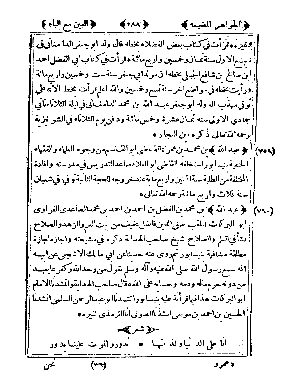 760 - عبد الله بن مُحَمَّد بن الْفضل بن أَحْمد بن أَحْمد بن مُحَمَّد الصاعدي الفراوي أَبُو البركات الملقب صفي الدّين فَاضل عفيف من بَيت الْعلم والزهد وَالصَّلَاح نَشأ فى الْعلم وَالصَّلَاح شيخ صَاحب الْهِدَايَة ذكره فى مشيخته وَأَجَازَهُ إجَازَة مُطلقَة مشافهة بنيسابور ثمَّ روى عَنهُ حَدِيثا عَن أبي مَالك الْأَشْجَعِيّ عَن أَبِيه أَنه سمع رَسُول الله صلى الله عَلَيْهِ وَسلم يَقُول من وحد الله وَكفر مِمَّا يعبد من دونه حرم مَاله وَدَمه وحسابه على الله قَالَ صَاحب الْهِدَايَة وأنشدنا الإِمَام أَبُو البركات هَذَا فِيمَا قرأته عَلَيْهِ بنيسابور أنشدنا أَبُو عبد الرَّحْمَن السّلمِيّ أنشدنا الْحُسَيْن بن أَحْمد بن مُوسَى أنشدنا الصولي أَنا التِّرْمِذِيّ لغيره شعر ... أَنا على الدُّنْيَا ولذاتها ... ندور وَالْمَوْت علينا يَدُور ...
