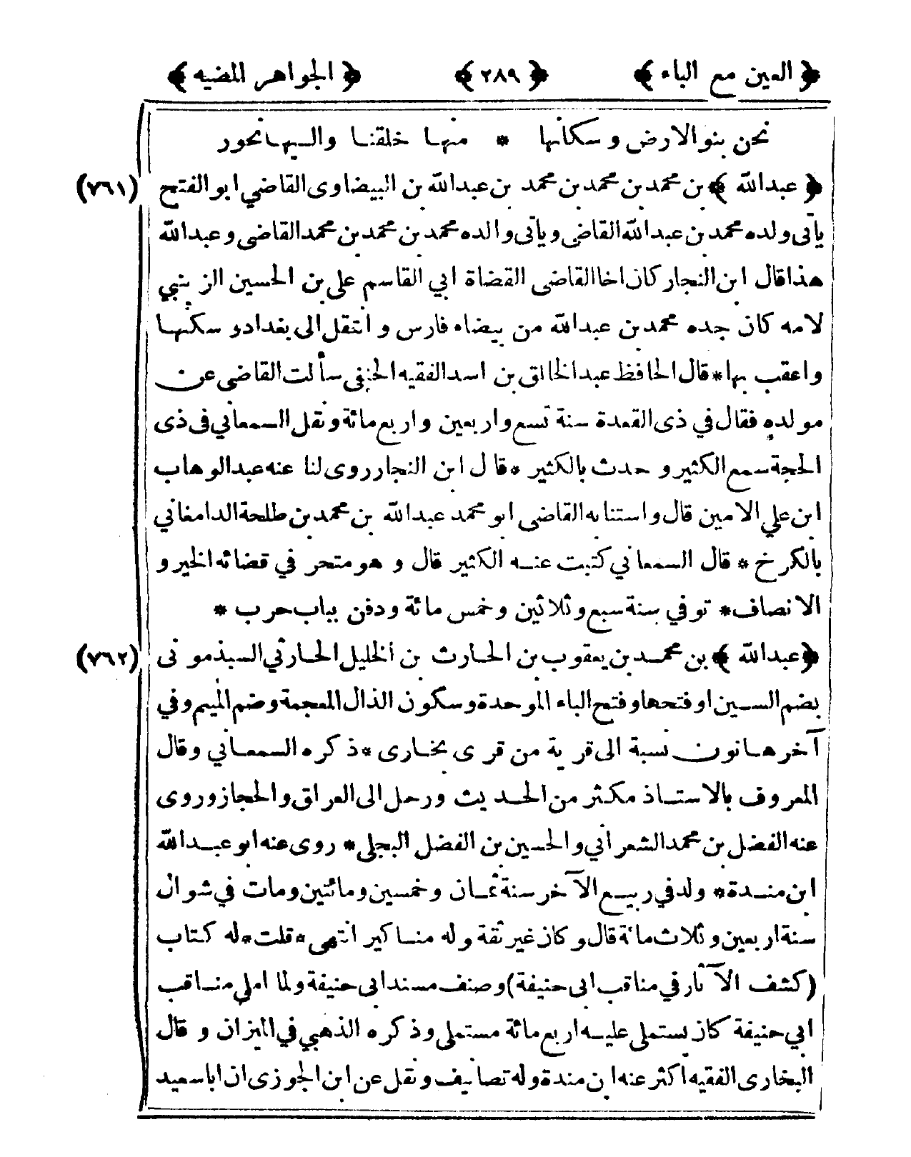 761 - عبد الله بن مُحَمَّد بن مُحَمَّد بن مُحَمَّد بن عبد الله بن الْبَيْضَاوِيّ القَاضِي أَبُو الْفَتْح يَأْتِي وَلَده مُحَمَّد بن عبد الله القَاضِي وَيَأْتِي وَالِده مُحَمَّد بن مُحَمَّد بن مُحَمَّد القَاضِي وَعبد الله هَذَا قَالَ ابْن النجار كَانَ أَخا القَاضِي الْقُضَاة أبي الْقَاسِم عَليّ بن الْحُسَيْن الزَّيْنَبِي لأمه كَانَ جده مُحَمَّد بن عبد الله من بَيْضَاء فَارس وانتقل إِلَى بَغْدَاد وسكنها وأعقب بهَا قَالَ الْحَافِظ عبد الْخَالِق بن أَسد الْفَقِيه الْحَنَفِيّ سَأَلت القَاضِي عَن مولده فَقَالَ فى ذِي الْقعدَة سنة تسع وَأَرْبَعين وَأَرْبع مائَة وَنقل السَّمْعَانِيّ فى ذِي الْحجَّة سمع الْكثير وَحدث بالكثير قَالَ ابْن النجار روى لنا عَنهُ عبد الْوَهَّاب ابْن عَليّ الْأمين قَالَ واستنابه القَاضِي أَبُو مُحَمَّد عبد الله بن مُحَمَّد بن طَلْحَة الدَّامغَانِي بالكرخ قَالَ السَّمْعَانِيّ كتبت عَنهُ الْكثير قَالَ وَهُوَ متحر فِي قَضَائِهِ الْخَيْر والإنصاف توفّي سنة سبع وَثَلَاثِينَ وَخمْس مائَة وَدفن بِبَاب حَرْب