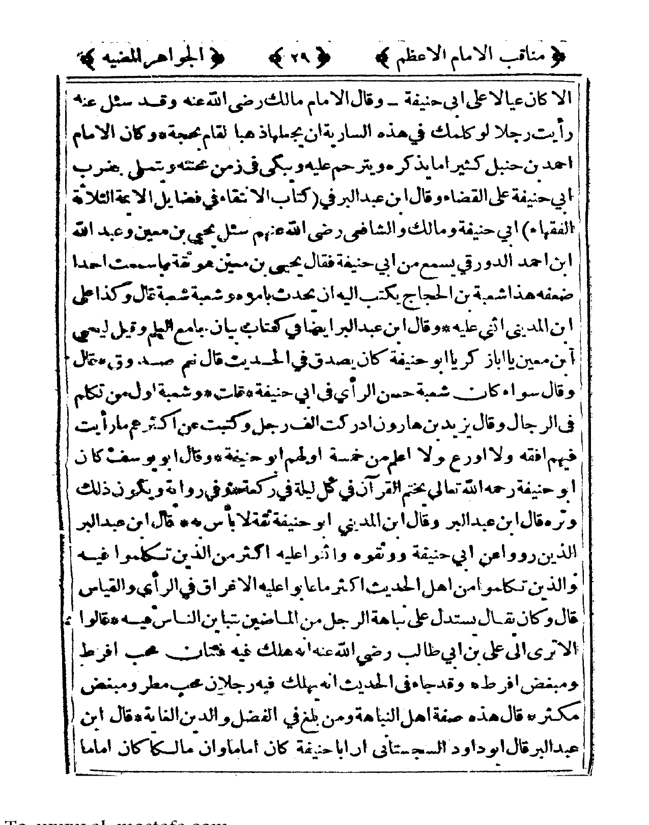 إِلَّا كَانَ عيالا على أبي حنيفَة وَقَالَ الإِمَام مَالك رضى الله عَنهُ وَقد سُئِلَ عَنهُ رَأَيْت رجلا لَو كلمك فى هَذِه السارية أَن يَجْعَلهَا ذَهَبا لقام بِحجَّة وَكَانَ الإِمَام أَحْمد بن حَنْبَل كثيرا مَا يذكرهُ ويترحم عَلَيْهِ ويبكي فى زمن محنته ويتسلى بِضَرْب أبي حنيفَة على الْقَضَاء وَقَالَ ابْن عبد الْبر فى كتاب الانتقاء فى فضايل الْأَئِمَّة الثَّلَاثَة الْفُقَهَاء أبي حنيفَة وَمَالك وَالشَّافِعِيّ رضى الله عَنْهُم سُئِلَ يحيى بن معِين وَعبد الله بن أَحْمد الدَّوْرَقِي يسمع من أبي حنيفَة فَقَالَ يحيى بن معِين هُوَ ثِقَة مَا سَمِعت أحدا ضعفه هَذَا شُعْبَة بن الْحجَّاج يكْتب إِلَيْهِ أَن يحدث بأَمْره وَشعْبَة شُعْبَة قَالَ وَكَذَا على ابْن الْمَدِينِيّ أثنى عَلَيْهِ وَقَالَ ابْن عبد الْبر أَيْضا فِي كتاب بَيَان جَامع الْعلم وَقيل ليحيى ابْن معِين يَا أَبَا زَكَرِيَّا أَبُو حنيفَة كَانَ يصدق فى الحَدِيث قَالَ نعم صَدُوق قَالَ وَقَالَ سَوَاء كَانَ شُعْبَة حسن الرَّأْي فى أبي حنيفَة قلت وَشعْبَة أول من تكلم فى الرِّجَال وَقَالَ يزِيد بن هَارُون أدْركْت ألف رجل وكتبت عَن أَكْثَرهم مَا رَأَيْت فيهم أفقه وَلَا أورع وَلَا أعلم من خَمْسَة أَوَّلهمْ أَبُو حنيفَة وَقَالَ أَبُو يُوسُف كَانَ أَبُو حنيفَة رَحمَه الله تَعَالَى يخْتم الْقُرْآن فى كل لَيْلَة فى رَكْعَة وفى رِوَايَة وَيكون ذَلِك فى وتره قَالَ ابْن عبد الْبر وَقَالَ ابْن الْمَدِينِيّ أَبُو حنيفَة ثِقَة لَا بَأْس بِهِ قَالَ ابْن عبد الْبر الَّذين رووا عَن أبي حنيفَة ووثقوه وأثنوا عَلَيْهِ أَكثر من الَّذين تكلمُوا فِيهِ وَالَّذين تكلمُوا من أهل الحَدِيث أَكثر مَا عابوا عَلَيْهِ الإغراق فى الرَّأْي وَالْقِيَاس قَالَ وَكَانَ يُقَال يسْتَدلّ على نباهة الرجل من الماضين بتباين النَّاس فِيهِ قَالُوا أَلا ترى إِلَى عَليّ بن أبي طَالب رضى الله عَنهُ أَنه هلك فِيهِ فئتان محب أفرط ومبغض أفرط وَقد جَاءَ فى الحَدِيث أَنه يهْلك فِيهِ رجلَانِ محب مطر ومبغض مكثر قَالَ هَذِه صفة أهل النباهة وَمن بلغ فى الْفضل وَالدّين الْغَايَة قَالَ ابْن عبد الْبر قَالَ أَبُو دَاوُد السجسْتانِي أَن أَبَا حنيفَة كَانَ إِمَامًا وَأَن مَالِكًا كَانَ إِمَامًا