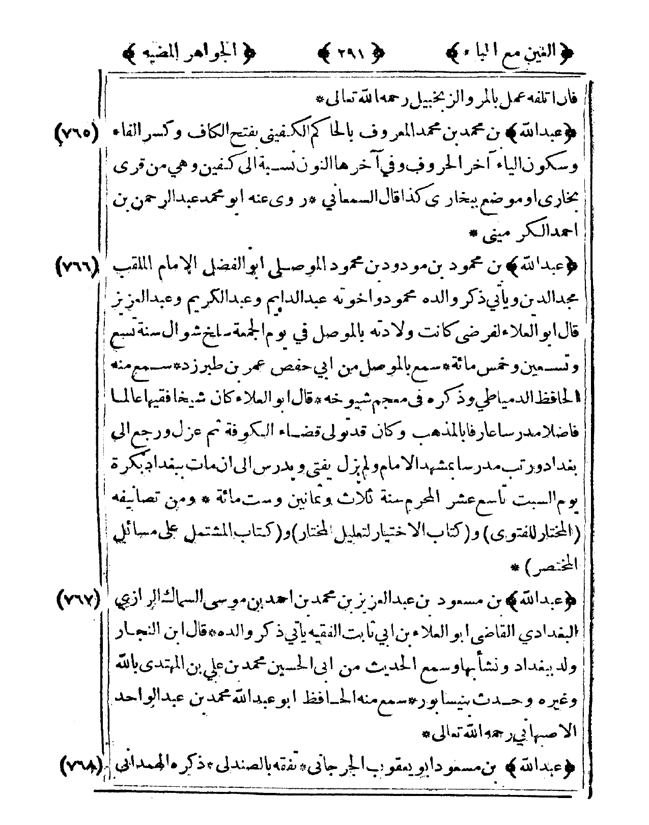 766 - عبد الله بن مَحْمُود بن مودود بن مَحْمُود الْموصِلِي أَبُو الْفضل الإِمَام الملقب مجد الدّين وَيَأْتِي ذكر وَالِده مَحْمُود وَإِخْوَته عبد الدايم وَعبد الْكَرِيم وَعبد الْعَزِيز قَالَ أَبُو الْعَلَاء الفرضي كَانَت وِلَادَته بالموصل فى يَوْم الْجُمُعَة سلخ شَوَّال سنة تسع وَتِسْعين وَخمْس مائَة سمع بالموصل من أبي حَفْص عمر بن طبرزد سمع مِنْهُ الْحَافِظ الدمياطي وَذكره فِي مُعْجم شُيُوخه قَالَ ابو الْعَلَاء كَانَ شَيخا فَقِيها عَالما فَاضلا مدرسا عَارِفًا بِالْمذهبِ وَكَانَ قد تولى قَضَاء الْكُوفَة ثمَّ عزل وَرجع إِلَى بَغْدَاد ورتب مدرسا بمشهد الإِمَام وَلم يزل يُفْتِي ويدرس إِلَى أَن مَاتَ بِبَغْدَاد بكرَة يَوْم السبت تَاسِع عشر الْمحرم سنة ثَلَاث وَثَمَانِينَ وست مائَة وَمن تصانيفه الْمُخْتَار اللّغَوِيّ وَكتاب الإختيار لتعليل الْمُخْتَار وَكتاب الْمُشْتَمل على مسَائِل الْمُخْتَصر