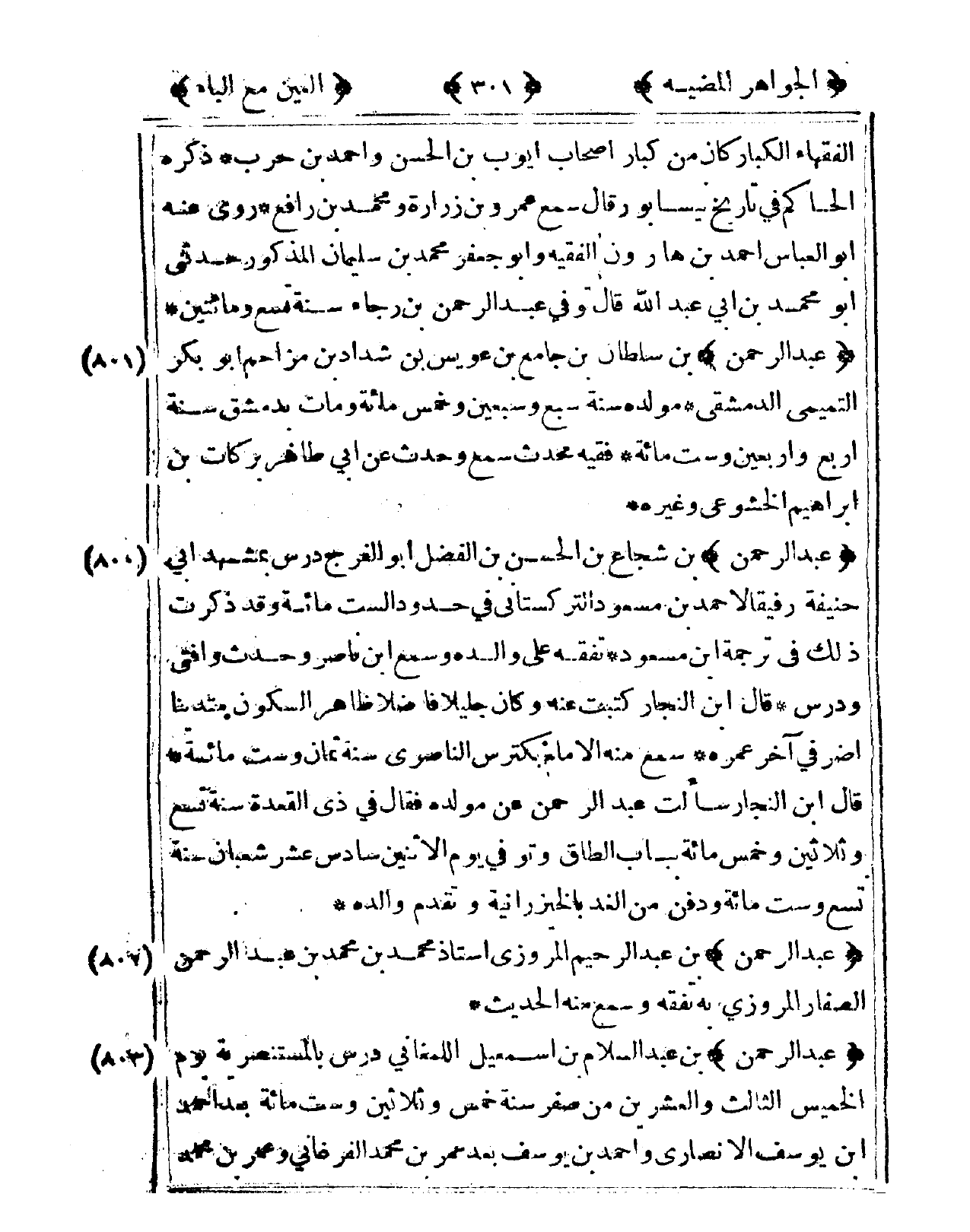 803 - عبد الرَّحْمَن بن عبد السَّلَام بن إِسْمَعِيل اللمغاني درس بالمستنصرية يَوْم الْخَمِيس الثَّالِث وَالْعِشْرين من صفر سنة خمس وَثَلَاثِينَ وست مائَة بعد أَحْمد ابْن يُوسُف الْأنْصَارِيّ وَأحمد بن يُوسُف بعد عمر بن مُحَمَّد الفرغاني وَعمر بن مُحَمَّد