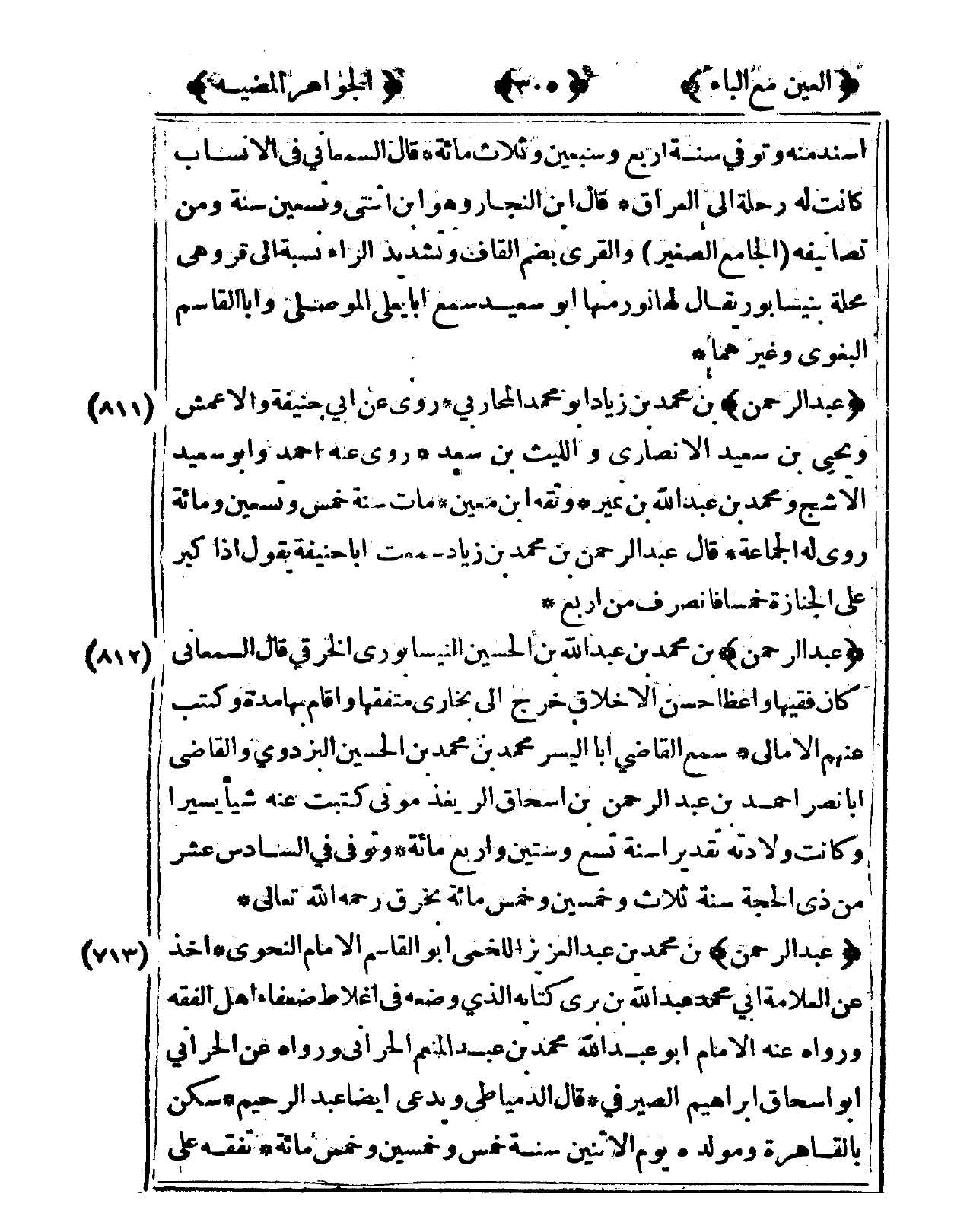 812 - عبد الرَّحْمَن بن مُحَمَّد بن عبد الله بن الْحُسَيْن النَّيْسَابُورِي الْخرقِيّ قَالَ السَّمْعَانِيّ كَانَ فَقِيها واعظا حسن الْأَخْلَاق خرج إِلَى بُخَارى متفقها وَأقَام بهَا مُدَّة وَكتب عَنْهُم الأمالي سمع القَاضِي أَبَا الْيُسْر مُحَمَّد بن مُحَمَّد بن الْحُسَيْن الْبَزْدَوِيّ وَالْقَاضِي أَبَا نصر أَحْمد بن عبد الرَّحْمَن بن إِسْحَاق الريغذموني كتبت عَنهُ شَيْئا يَسِيرا وَكَانَت وِلَادَته تَقْديرا سنة تسع وَسِتِّينَ وَأَرْبع مائَة وَتُوفِّي فى السَّادِس عشر من ذِي الْحجَّة سنة ثَلَاث وَخمسين وَخمْس مائَة بخرق رَحمَه الله تَعَالَى