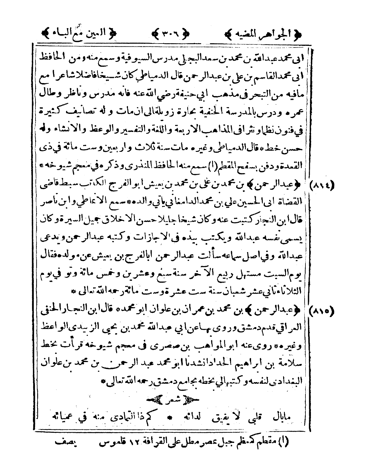 815 - عبد الرَّحْمَن بن مُحَمَّد بن عمرَان بن علوان أَبُو مُحَمَّد قَالَ ابْن النجار الْحَنَفِيّ الْعِرَاقِيّ قدم دمشق وروى بهَا عَن أبي عبد الله مُحَمَّد بن يحيى الزبيدِيّ الْوَاعِظ وَغَيره روى عَنهُ أَبُو الْمَوَاهِب بن صصري فى مُعْجم شُيُوخه قَرَأت بِخَط سَلامَة بن إِبْرَاهِيم الْحداد أنشدنا أَبُو مُحَمَّد عبد الرَّحْمَن بن مُحَمَّد بن علوان الْبَغْدَادِيّ لنَفسِهِ وكتبها لي بِخَطِّهِ بِجَامِع دمشق رَحمَه الله تَعَالَى شعر ... مَا بَال قلبِي لَا يفِيق لدائه ... كم ذَا التَّمَادِي مِنْهُ فى عميائه ...