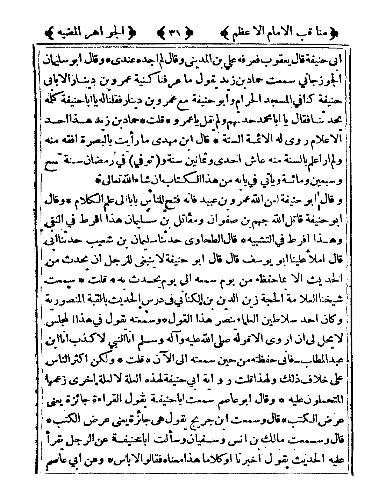 وَقَالَ أَبُو حنيفَة لمن الله عَمْرو بن عبيد فَإِنَّهُ فتح للنَّاس بَابا إِلَى علم الْكَلَام وَقَالَ أَبُو حنيفَة قَاتل الله جهم بن صَفْوَان وَمُقَاتِل بن سُلَيْمَان هَذَا أفرط فى النَّفْي وَهَذَا أفرط فى التَّشْبِيه قَالَ الطَّحَاوِيّ حَدثنَا سُلَيْمَان بن شُعَيْب حَدثنَا أبي قَالَ املأ علينا أَبُو يُوسُف قَالَ قَالَ أَبُو حنيفَة لَا يَنْبَغِي للرجل أَن يحدث من الحَدِيث إِلَّا بِمَا حفظه من يَوْم سَمعه إِلَى يَوْم يحدث بِهِ قلت سَمِعت شَيخنَا الْعَلامَة الْحجَّة زيد الدّين بن الْكِنَانِي فى درس الحَدِيث بالقبة المنصورية وَكَانَ أحد سلاطين الْعلمَاء ينصر هَذَا القَوْل وسمعته يَقُول فى هَذَا الْمجْلس لَا يحل لي أَن أروي إِلَّا قَوْله صلى الله عَلَيْهِ وَسلم أَنا النَّبِي لَا كذب أَنا ابْن عبد الْمطلب فَإِنِّي حفظته من حِين سمعته إِلَى الْآن قلت وَلَكِن أَكثر النَّاس على خلاف ذَلِك وَلِهَذَا قلت رِوَايَة أبي حنيفَة لهَذِهِ الْعلَّة لَا لعِلَّة أُخْرَى زعمها المتحملون عَلَيْهِ وَقَالَ أَبُو عَاصِم سَمِعت أَبَا حنيفَة يَقُول الْقِرَاءَة جَائِزَة يَعْنِي عرض الْكتب قَالَ وَسمعت ابْن جريج يَقُول هى جَائِزَة يَعْنِي عرض الْكتب قَالَ وَسمعت مَالك بن أنس وسُفْيَان وَسَأَلت أَبَا حنيفَة عَن الرجل يقْرَأ عَلَيْهِ الحَدِيث يَقُول أخبرنَا أَو كلَاما هَذَا مَعْنَاهُ فَقَالُوا لَا بَأْس وَعَن أبي عَاصِم
