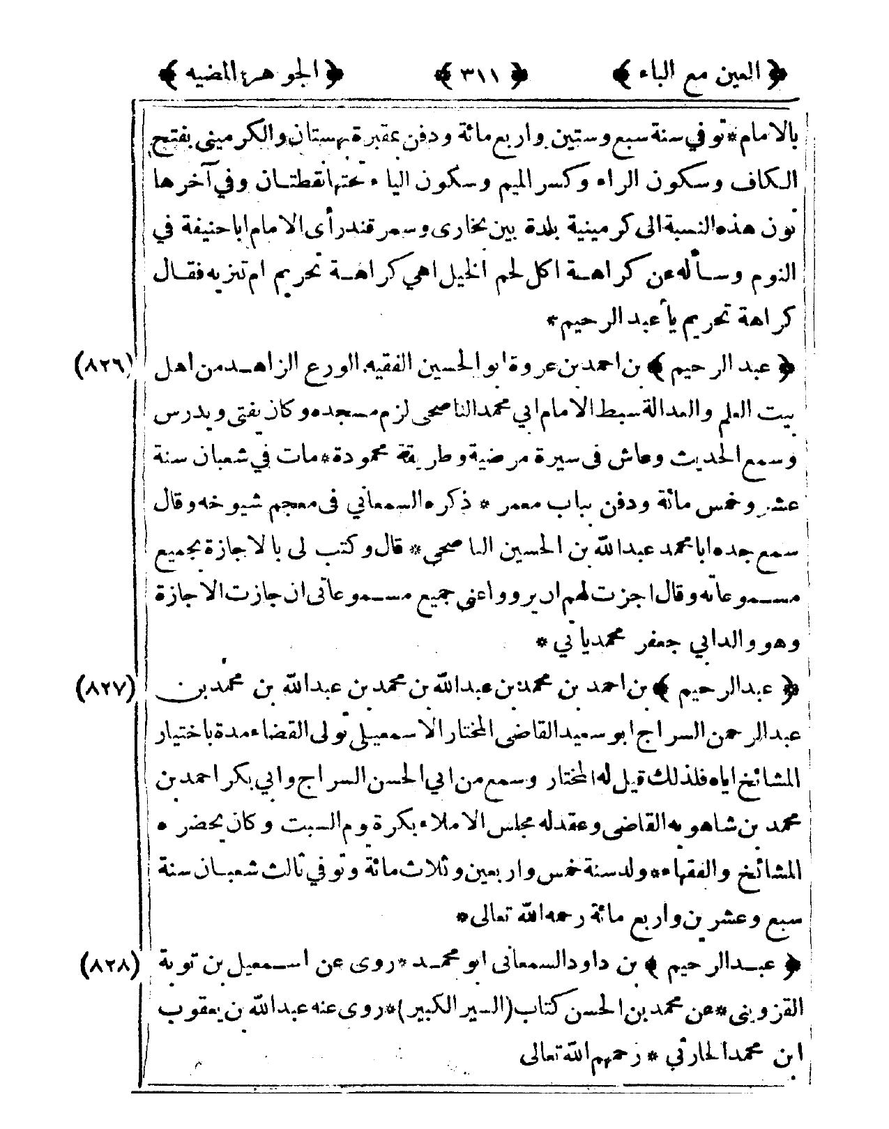 828 - عبد الرَّحِيم بن دَاوُد السَّمْعَانِيّ أَبُو مُحَمَّد روى عَن إِسْمَعِيل بن تَوْبَة الْقزْوِينِي عَن مُحَمَّد بن الْحسن كتاب السّير الْكَبِير روى عَنهُ عبد الله بن يَعْقُوب ابْن مُحَمَّد الْحَارِثِيّ رَحِمهم الله تَعَالَى