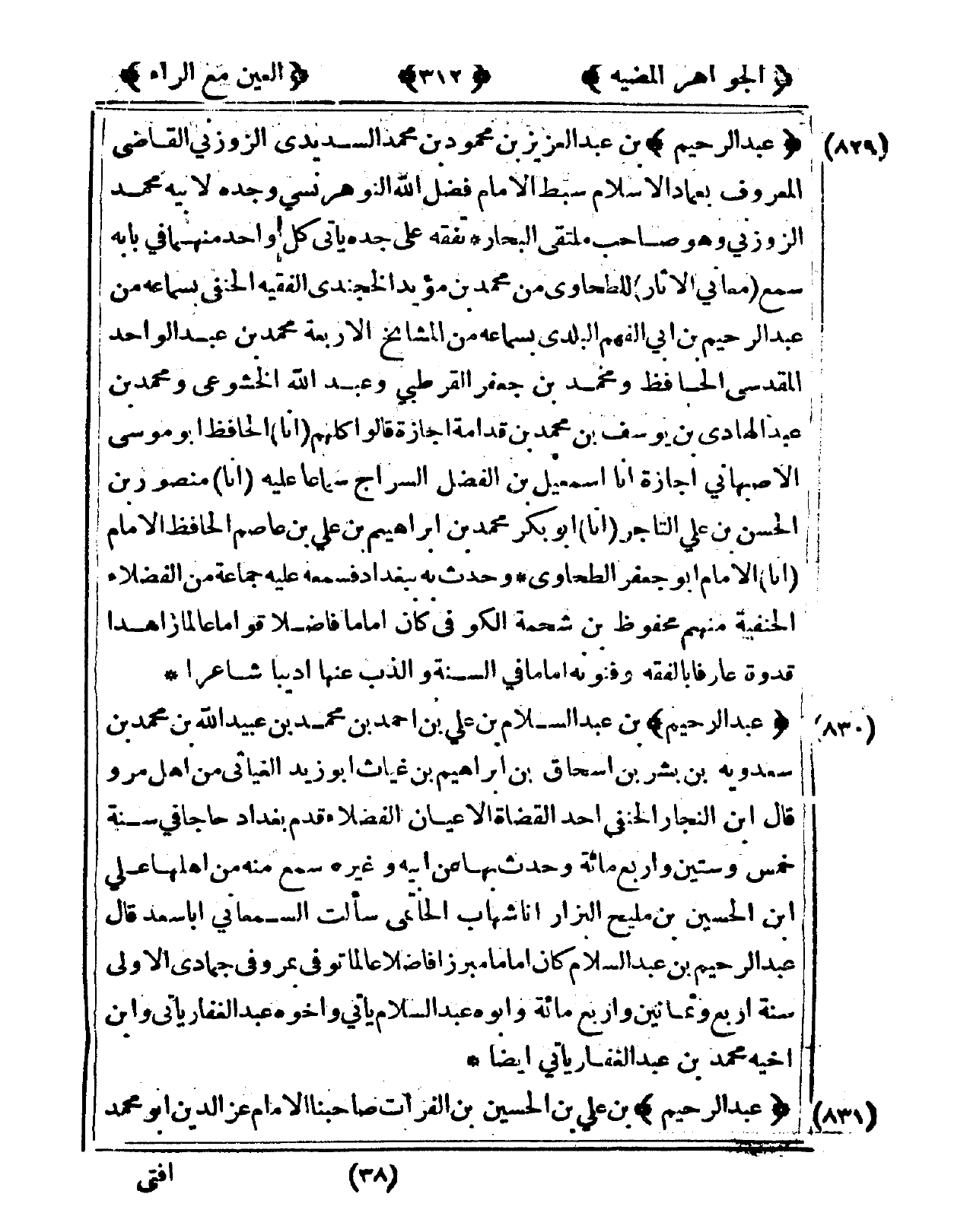 829 - عبد الرَّحِيم بن عبد الْعَزِيز بن مَحْمُود بن مُحَمَّد السديدي الزوزني القَاضِي الْمَعْرُوف بعماد الْإِسْلَام سبط الإِمَام فضل الله النوهرنسي وجده لِأَبِيهِ مُحَمَّد الزوزني وَهُوَ صَاحب ملتقى الْبحار تفقه على جده يَأْتِي كل وَاحِد مِنْهُمَا فى بَابه سمع مَعَاني الْآثَار للطحاوي من مُحَمَّد بن مؤيد الخجندي الْفَقِيه الْحَنَفِيّ بِسَمَاعِهِ من عبد الرَّحِيم بن أبي الْفَهم الْبَلَدِي بِسَمَاعِهِ من الْمَشَايِخ الْأَرْبَعَة مُحَمَّد بن عبد الْوَاحِد الْمَقْدِسِي الْحَافِظ وَمُحَمّد بن جَعْفَر الْقُرْطُبِيّ وَعبد الله الخشوعي وَمُحَمّد بن عبد الْهَادِي بن يُوسُف بن مُحَمَّد بن قدامَة أجازة قَالُوا كلهم أَنا الْحَافِظ أَبُو مُوسَى الْأَصْبَهَانِيّ أجازة أَن إِسْمَعِيل بن الْفضل السراج سَمَاعا عَلَيْهِ أَنا مَنْصُور بن الْحسن بن عَليّ التَّاجِر أَنا أَبُو بكر مُحَمَّد بن إِبْرَاهِيم بن عَليّ بن عَاصِم الْحَافِظ الإِمَام أَنا الإِمَام أَبُو جَعْفَر الطَّحَاوِيّ وَحدث بِهِ بِبَغْدَاد فَسَمعهُ عَلَيْهِ جمَاعَة من الْفُضَلَاء الْحَنَفِيَّة مِنْهُم مَحْفُوظ بن شحمة الْكُوفِي كَانَ إِمَامًا فَاضلا قواما عَالما زاهدا قدوة عَارِفًا بالفقه وفنونه إِمَامًا فى السّنة والذب عَنْهَا أديبا شَاعِرًا