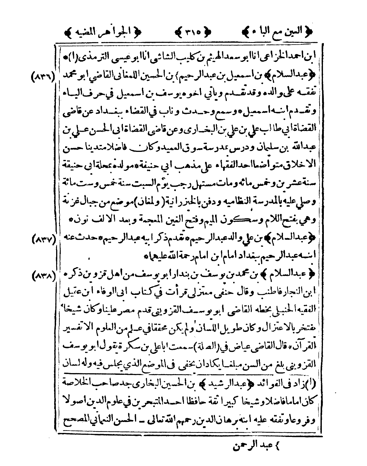 837 - عبد السَّلَام بن عَليّ وَالِد عبد الرَّحِيم تقدم ذكر أَبِيه عبد الرحيم حدث عَنهُ ابْنه عبد الرَّحِيم بِبَغْدَاد إِمَام ابْن إِمَام رَحْمَة الله عَلَيْهِمَا