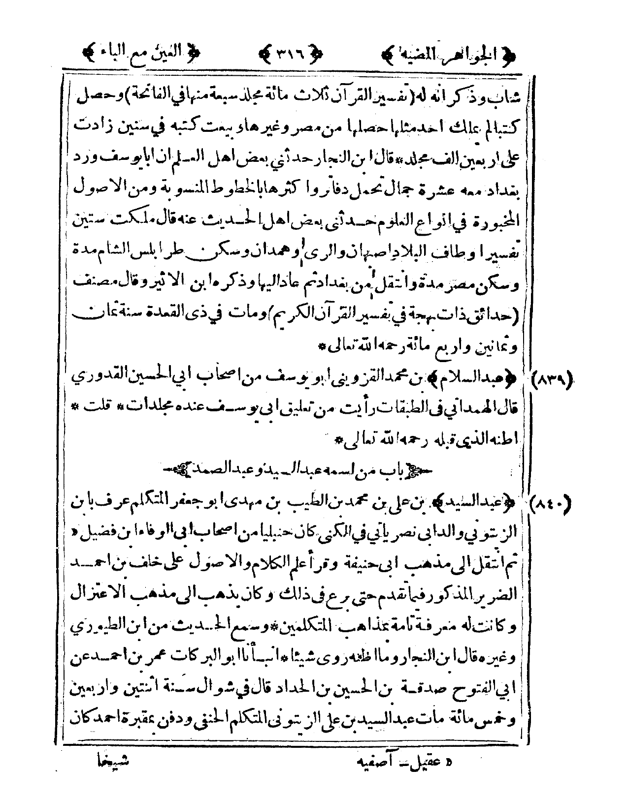 839 - عبد السَّلَام بن مُحَمَّد الْقزْوِينِي أَبُو يُوسُف من أَصْحَاب أبي الْحُسَيْن الْقَدُورِيّ قَالَ الْهَمدَانِي فى الطَّبَقَات رَأَيْت من تَعْلِيق أبي يُوسُف عِنْده مجلدات قلت أَظُنهُ الَّذِي قبله رَحمَه الله تَعَالَى