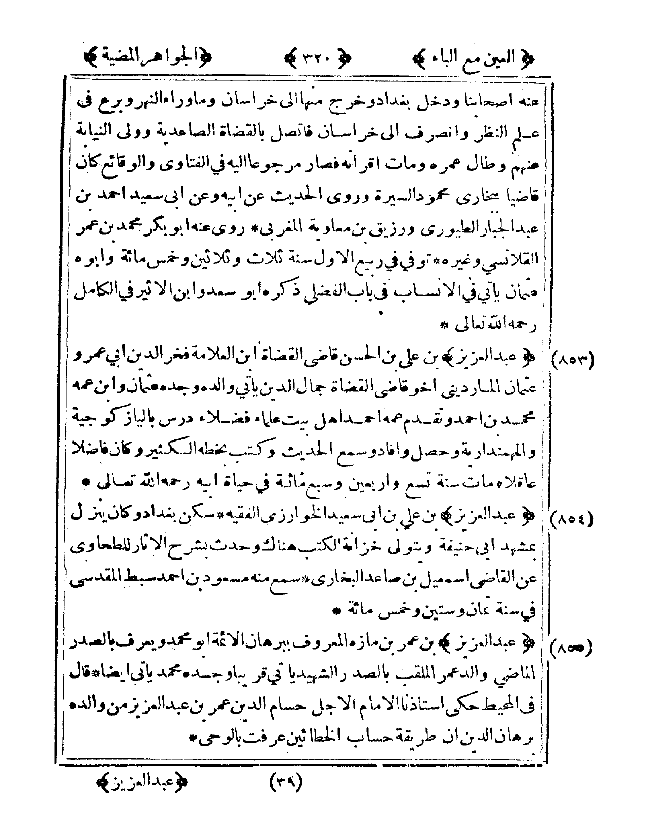 855 - عبد الْعَزِيز بن عمر بن مازه الْمَعْرُوف ببرهان الْأَئِمَّة أَبُو مُحَمَّد وَيعرف بالصدر الْمَاضِي وَالِد عمر الملقب بالصدر الشَّهِيد يَأْتِي قَرِيبا وجده مُحَمَّد يَأْتِي أَيْضا قَالَ فى الْمُحِيط حكى استاذنا الإِمَام الْأَجَل حسام الدّين عمر بن عبد الْعَزِيز من وَالِده برهَان الدّين أَن طَريقَة حِسَاب االخاطئين عرفت بِالْوَحْي