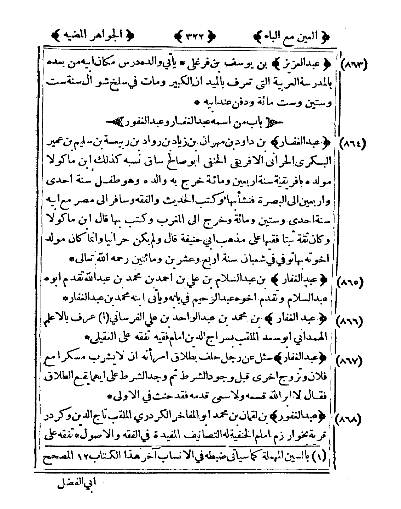 868 - عبد الغفور بن لُقْمَان بن مُحَمَّد أَبُو المفاخر الكردري الملقب تَاج الدّين وكردر قَرْيَة بخوارزم إِمَام الْحَنَفِيَّة لَهُ التصانيف المفيدة فى الْفِقْه وَالْأُصُول تفقه على