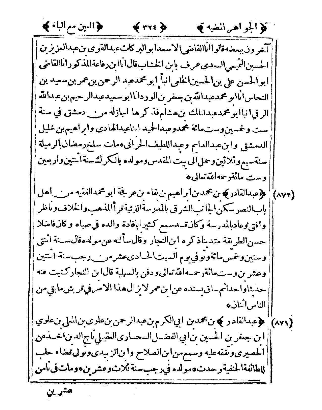 871 - عبد الْقَادِر بن مُحَمَّد بن أبي الْكَرم بن عبد الرَّحْمَن بن علوى بن الْمُعَلَّى بن علوي ابْن جَعْفَر بن الْحُسَيْن بن أَبى الْفضل السحاري الْعقيلِيّ تَاج الدّين أَخذ عَن الحصيري وتفقه عَلَيْهِ وَسمع من ابْن الصّلاح وَابْن الزبيدِيّ وَتَوَلَّى قَضَاء حلب للطائفة الْحَنَفِيَّة وَحدث مولده فى رَجَب سنة ثَلَاث وَعشْرين وَمَات فى ثامن