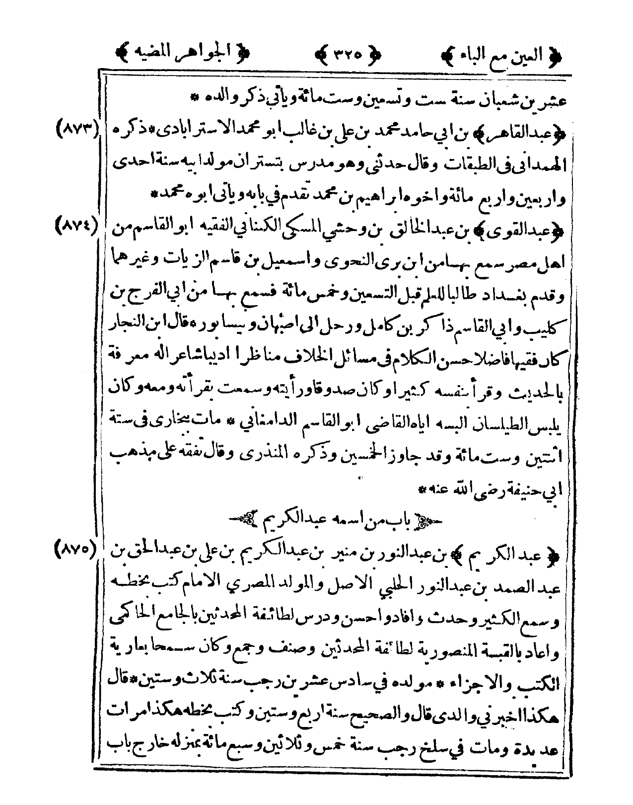 875 - عبد الْكَرِيم بن عبد النُّور بن مُنِير بن عبد الْكَرِيم بن عَليّ بن عبد الْحق بن عبد الصَّمد بن عبد النُّور الْحلَبِي الأَصْل والمولد الْمصْرِيّ الإِمَام كتب بِخَطِّهِ وَسمع الْكثير وَحدث وَأفَاد وَأحسن ودرس لطائفة الْمُحدثين بالجامع الحاكمي وَأعَاد بالقبة المنصورية لطائفة الْمُحدثين وصنف وَجمع وَكَانَ سَمحا بعارية الْكتب والأجزاء مولده فى سادس عشْرين رَجَب سنة ثَلَاث وَسِتِّينَ قَالَ هَكَذَا أَخْبرنِي وَالِدي قَالَ وَالصَّحِيح سنة أَربع وَسِتِّينَ وَكتب بِخَطِّهِ هَكَذَا مَرَّات عديدة وَمَات فى سلخ رَجَب سنة خمس وَثَلَاثِينَ وَسبع مائَة بمنزله خَارج بَاب