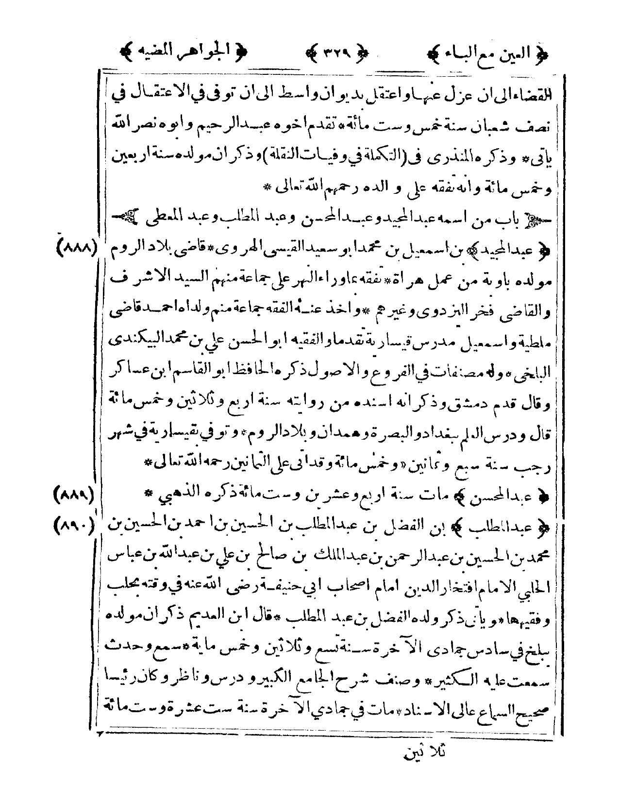890 - عبد الْمطلب بن الْفضل بن عبد الْمطلب بن الْحُسَيْن بن أَحْمد بن الْحُسَيْن بن مُحَمَّد بن الْحُسَيْن بن عبد الرَّحْمَن بن عبد الْملك بن صَالح بن عَليّ بن عبد الله بن عَبَّاس الْحلَبِي الإِمَام افتخار الدّين إِمَام أَصْحَاب أبي حنيفَة رَضِي الله عَنهُ فى وقته بحلب وفقيهها وَيَأْتِي ذكر وَلَده الْفضل بن عبد الْمطلب قَالَ ابْن العديم ذكر أَن مولده ببلخ فى سادس جمادي الْآخِرَة سنة تسع وَثَلَاثِينَ وَخمْس ماية سمع وَحدث سَمِعت عَلَيْهِ الْكثير وصنف شرح الْجَامِع الْكَبِير ودرس وناظر وَكَانَ رَئِيسا صَحِيح السماع عالي الْإِسْنَاد مَاتَ فى جمادي الْآخِرَة سنة سِتّ عشرَة وست مائَة