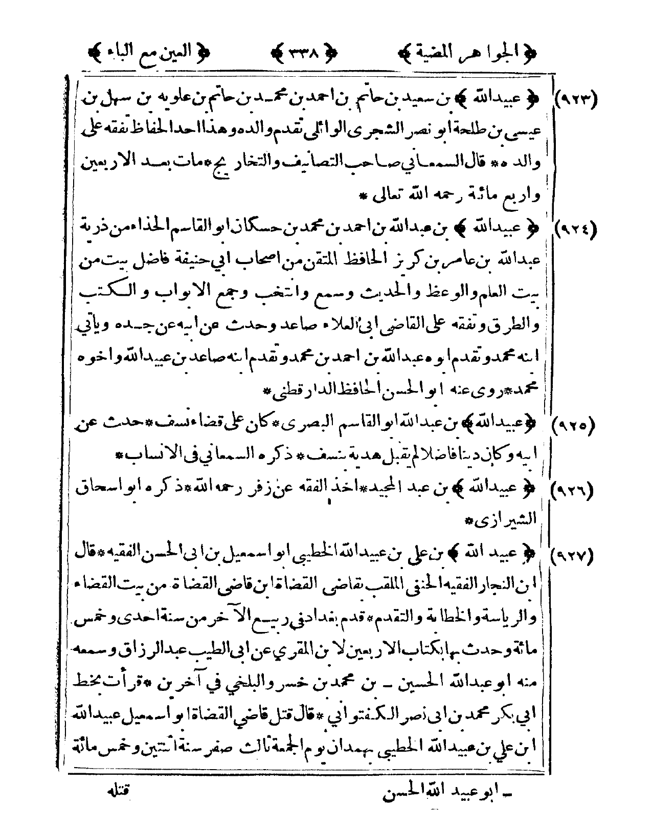 923 - عبيد الله بن سعيد بن حَاتِم بن أَحْمد بن مُحَمَّد بن حَاتِم بن عُلْوِيَّهُ بن سهل بن عِيسَى بن طَلْحَة أَبُو نصر الشجري الوائلي تقدم وَالِده وَهَذَا أحد الْحفاظ تفقه على وَالِده قَالَ السَّمْعَانِيّ صَاحب التصانيف والتاريخ مَاتَ بعد الْأَرْبَعين وَأَرْبع مائَة رَحمَه الله تَعَالَى