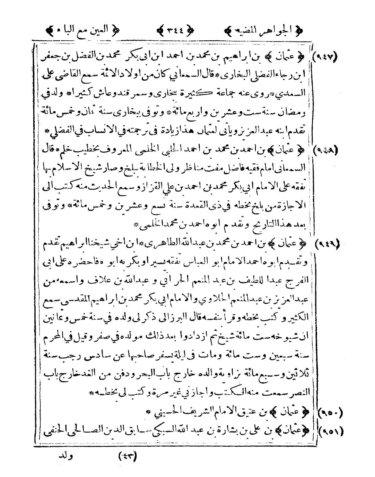 947 - عُثْمَان بن إِبْرَاهِيم بن مُحَمَّد بن أَحْمد بن أبي بكر مُحَمَّد بن الْفضل بن جَعْفَر ابْن رَجَاء الفضلي البُخَارِيّ قَالَ السَّمْعَانِيّ كَانَ من أَوْلَاد الْأَئِمَّة سمع القَاضِي عَليّ السغدي روى عَنهُ جمَاعَة كَثِيرَة ببخارى وسمرقند وعاش كثيرا ولد فى رَمَضَان سنة سِتّ وَعشْرين وَأَرْبع مائَة وَتُوفِّي ببخارى سنة ثَمَان وَخمْس مائَة تقدم ابْنه عبد الْعَزِيز وَيَأْتِي لعُثْمَان هَذَا زِيَادَة فى تَرْجَمته فى الْأَنْسَاب فى الفضلي