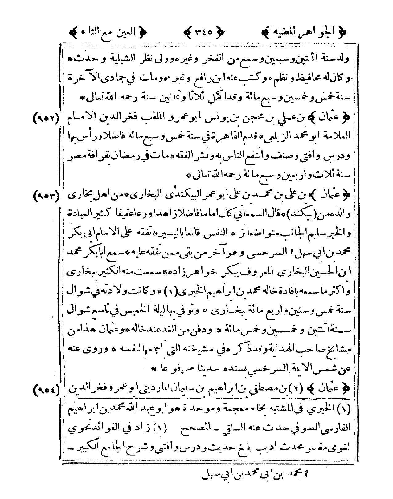 952 - عُثْمَان بن عَليّ بن محجن بن يُونُس أَبُو عَمْرو الملقب فَخر الدّين الإِمَام الْعَلامَة أَبُو مُحَمَّد الزَّيْلَعِيّ قدم الْقَاهِرَة فى سنة خمس وَسبع مائَة فَاضلا وَرَأس بهَا ودرس وَأفْتى وصنف وانتفع النَّاس بِهِ وَنشر الْفِقْه مَاتَ فى رَمَضَان بقرافة مصر سنة ثَلَاث وَأَرْبَعين وَسبع مائَة رَحمَه الله تَعَالَى