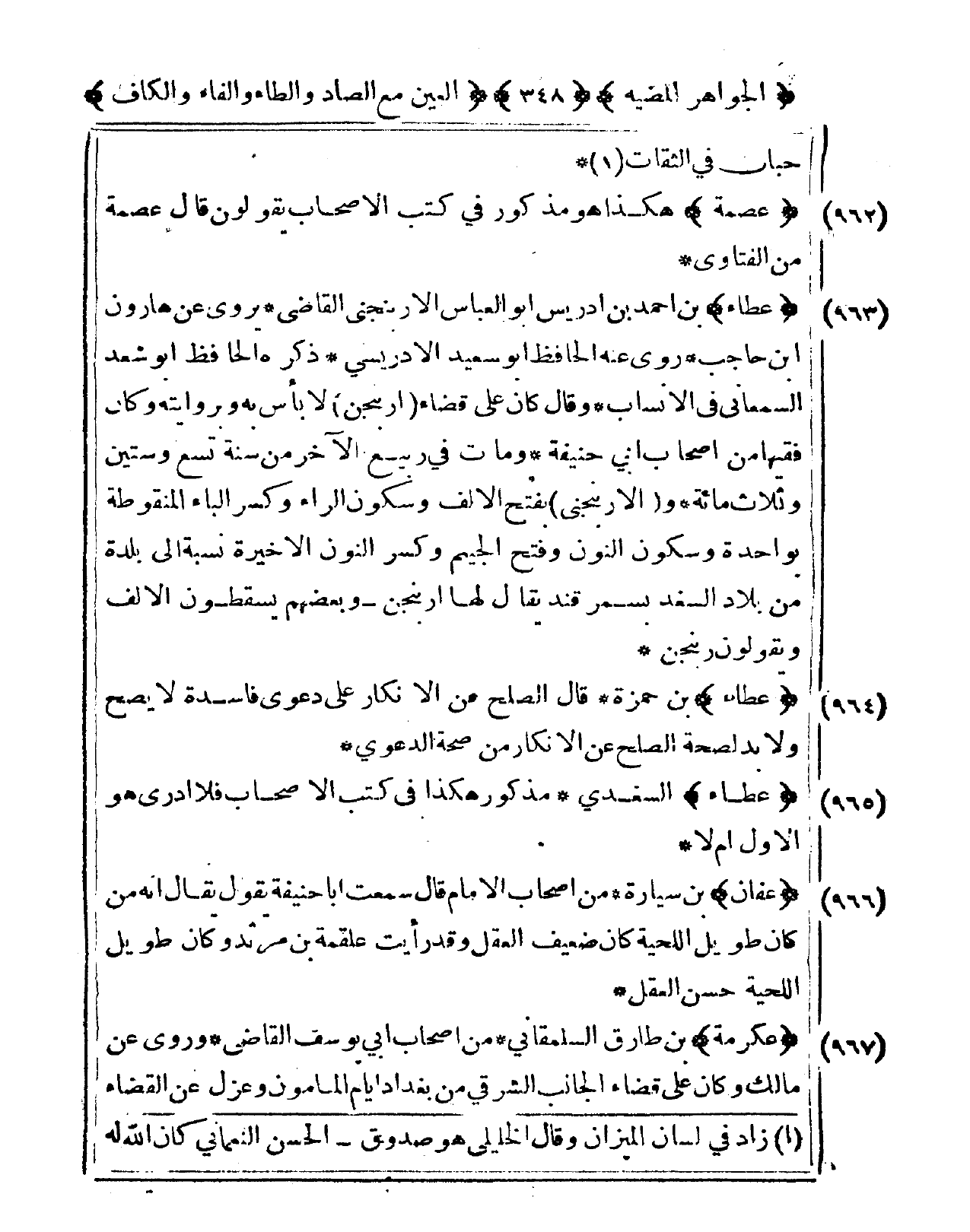 966 - عَفَّان بن سيارة من أَصْحَاب الإِمَام قَالَ سَمِعت أَبَا حنيفَة يَقُول يُقَال أَنه من كَانَ طَوِيل اللِّحْيَة كَانَ ضَعِيف الْعقل وَقد رَأَيْت عَلْقَمَة بن مرْثَد وَكَانَ طَوِيل اللِّحْيَة حسن الْعقل