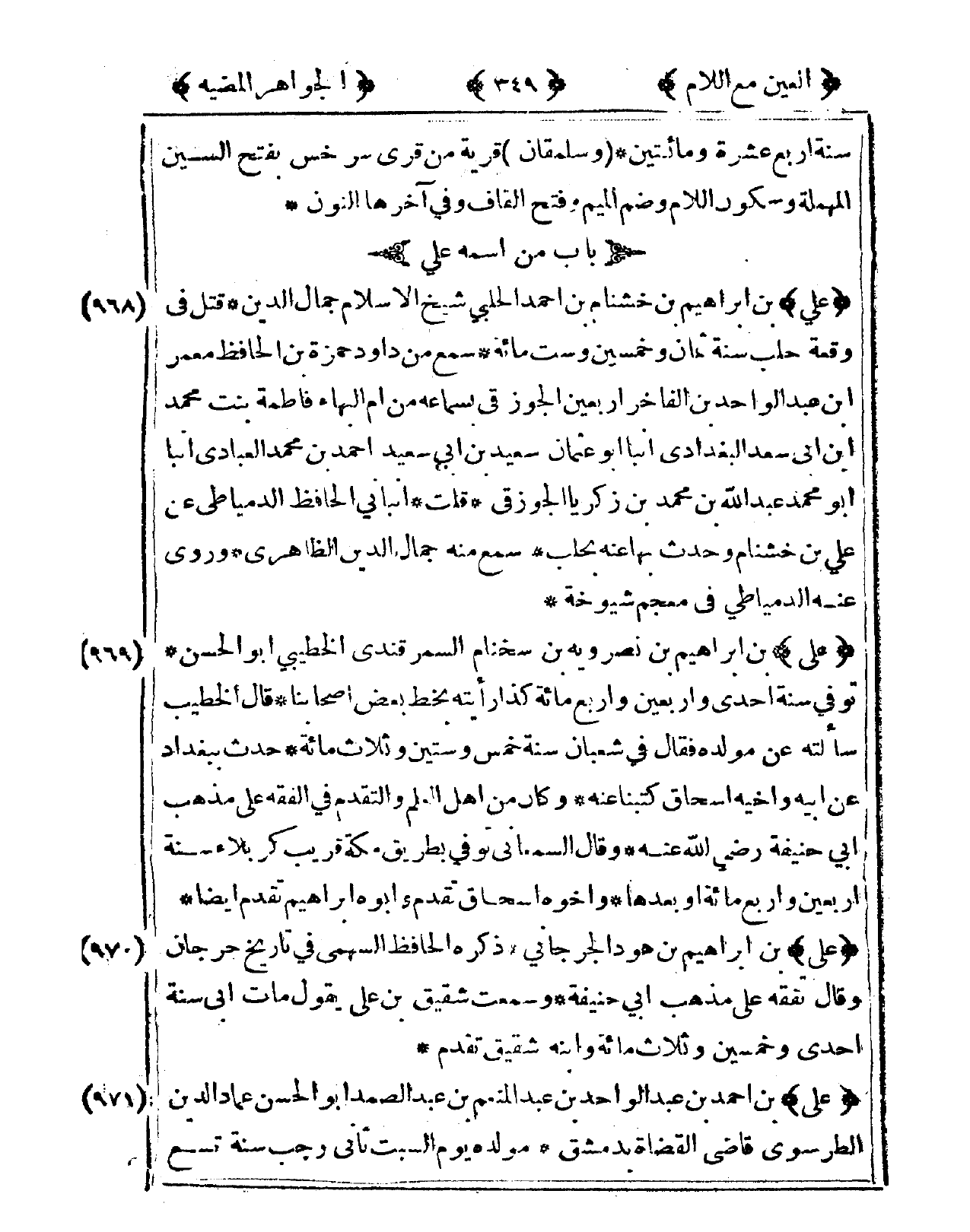 969 - عَليّ بن إِبْرَاهِيم بن نصرويه بن سخنام السَّمرقَنْدِي الخطيبي أَبُو الْحسن توفّي سنة إِحْدَى وَأَرْبَعين وَأَرْبع مائَة كَذَا رَأَيْته بِخَط بعض أَصْحَابنَا قَالَ الْخَطِيب سَأَلته عَن مولده فَقَالَ فى شعْبَان سنة خمس وَسِتِّينَ وَثَلَاث مائَة حدث بِبَغْدَاد عَن أَبِيه وأخيه إِسْحَاق كتبنَا عَنهُ وَكَانَ من أهل الْعلم والتقدم فى الْفِقْه على مَذْهَب أبي حنيفَة رَضِي الله عَنهُ وَقَالَ السَّمْعَانِيّ توفّي بطرِيق مَكَّة قريب كربلاء سنة أَرْبَعِينَ وَأَرْبع مائَة أَو بعْدهَا وَأَخُوهُ إِسْحَاق تقدم وَأَبوهُ إِبْرَاهِيم تقدم أَيْضا