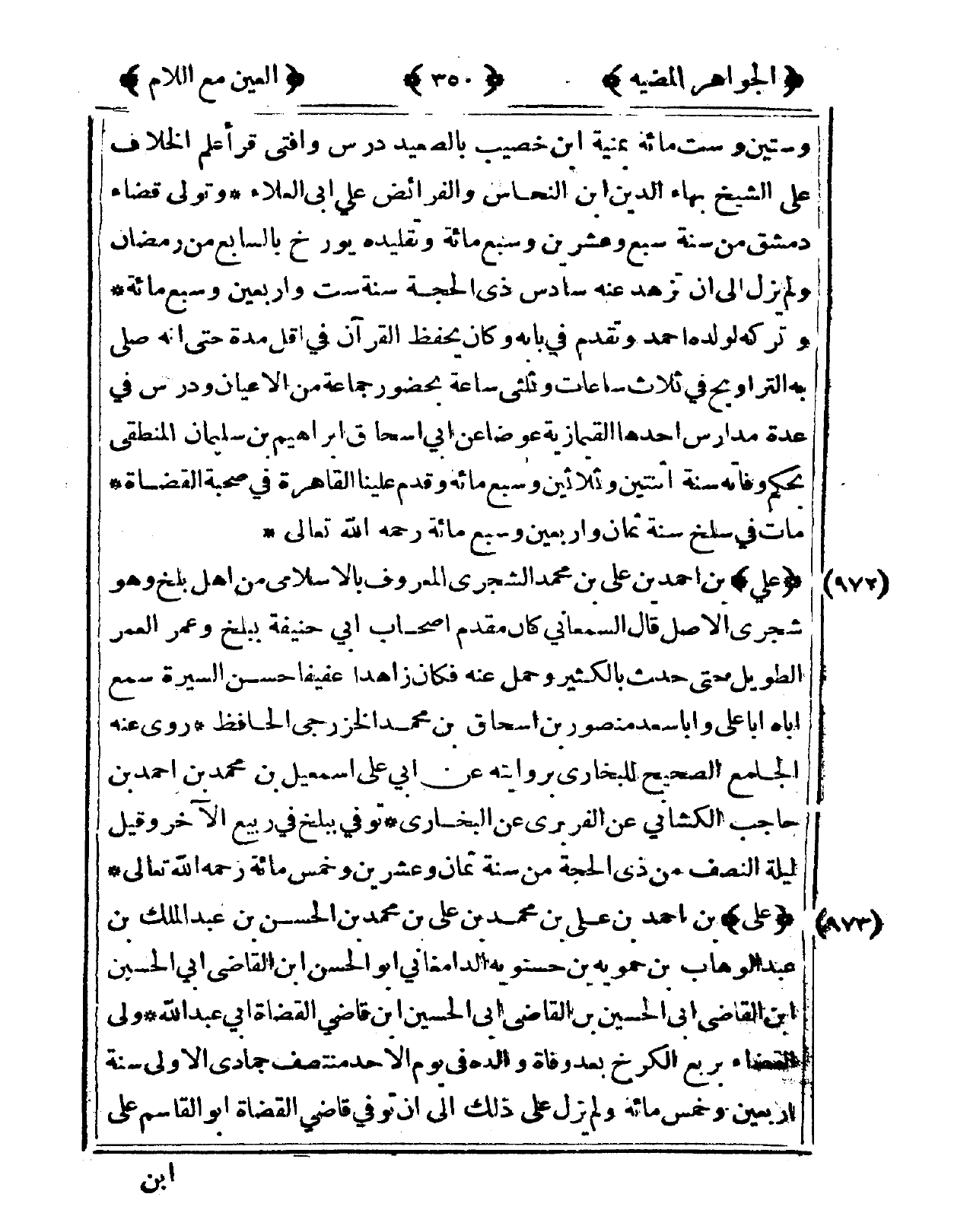 972 - عَليّ بن أَحْمد بن عَليّ بن مُحَمَّد الشجري الْمَعْرُوف بالإسلامي من أهل بَلخ وَهُوَ شجري الأَصْل قَالَ السَّمْعَانِيّ كَانَ مقدم أَصْحَاب أبي حنيفَة ببلخ وَعمر الْعُمر الطَّوِيل حَتَّى حدث بالكثير وَحمل عَنهُ فَكَانَ زاهدا عفيفا حسن السِّيرَة سمع أَبَاهُ أَبَا عَليّ وَأَبا سعد مَنْصُور بن إِسْحَاق بن مُحَمَّد الخزرجي الْحَافِظ روى عَنهُ الْجَامِع الصَّحِيح للْبُخَارِيّ بروايته عَن أبي عَليّ إِسْمَعِيل بن مُحَمَّد بن أَحْمد بن حَاجِب الكشاني عَن الْفربرِي عَن البُخَارِيّ توفّي ببلخ فى ربيع الآخر وَقيل لَيْلَة النّصْف من ذِي الْحجَّة من سنة ثَمَان وَعشْرين وَخمْس مائَة رَحمَه الله تَعَالَى