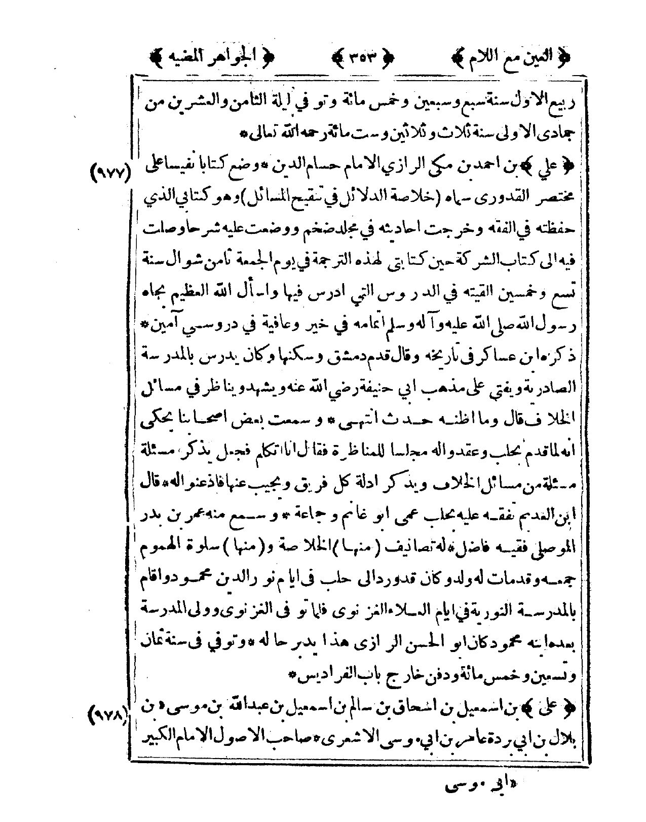 977 - عَليّ بن أَحْمد بن مكي الرَّازِيّ الإِمَام حسام الدّين وضع كتابا نفيسا على مُخْتَصر الْقَدُورِيّ سَمَّاهُ خُلَاصَة الدَّلَائِل فى تَنْقِيح الْمسَائِل وَهُوَ كتابي الذى حفظته فى الْفِقْه وَخرجت أَحَادِيثه فى مُجَلد ضخم وَوضعت عَلَيْهِ شرحا وصلت فِيهِ إِلَى كتاب الشّركَة حِين كتابتي لهَذِهِ التَّرْجَمَة فى يَوْم الْجُمُعَة ثامن شَوَّال سنة تسع وَخمسين أَلقيته فى الدُّرُوس الَّتِى أدرس فِيهَا وأسأل الله الْعَظِيم بجاه رَسُول الله صلى الله عَلَيْهِ وَسلم إِتْمَامه فى خير وعافية فى دروسي آمين ذكره ابْن عَسَاكِر فى تَارِيخه وَقَالَ قدم دمشق وسكنها وَكَانَ يدرس بِالْمَدْرَسَةِ الصادرية ويفتي على مَذْهَب أبي حنيفَة رَضِي الله عَنهُ وَيشْهد ويناظر فى مسَائِل الْخلاف قَالَ وَمَا أَظُنهُ حدث انْتهى وَسمعت بعض أَصْحَابنَا يَحْكِي أَنه لما قدم بحلب وعقدوا لَهُ مَجْلِسا للمناظرة فَقَالَ أَنا أتكم فَجعل يذكر مسئلة مسئلة من مسَائِل الْخلاف وَيذكر أَدِلَّة كل فريق ويجيب عَنْهَا فأذعنوا لَهُ قَالَ ابْن العديم تفقه عَلَيْهِ بحلب عمي أَبُو غَانِم وَجَمَاعَة وَسمع مِنْهُ عمر بن بدر الْموصِلِي فَقِيه فَاضل لَهُ تصانيف مِنْهَا الْخُلَاصَة وَمِنْهَا سلوة الهموم جمعه وَقد مَاتَ لَهُ ولد وَكَانَ قد ورد إِلَى حلب فى أَيَّام نور الدّين مَحْمُود وَأقَام بِالْمَدْرَسَةِ النورية فى أَيَّام الْعَلَاء الغزنوي فَلَمَّا توفّي الغزنوي وَولى الْمدرسَة بعده ابْنه مَحْمُود كَانَ أَبُو الْحسن الرَّازِيّ هَذَا يدبر حَاله وَتُوفِّي فى سنة ثَمَان وَتِسْعين وَخمْس مائَة وَدفن خَارج بَاب الفراديس