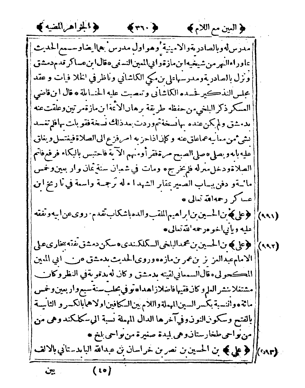 992 - عَليّ بن الْحُسَيْن بن مُحَمَّد الْبَلْخِي السكلكندي سكن دمشق تفقه ببخارى على الإِمَام عبد الْعَزِيز بن عمر بن مازة وروى الحَدِيث بِدِمَشْق عَن أبي الْمعِين المكحولي قَالَ السَّمْعَانِيّ لَقيته بِدِمَشْق وَكَانَ لَهُ يَد قَوِيَّة فى النّظر وَكَانَ مشتغلا بنشر الْعلم وَكَانَ فَقِيها فَاضلا زاهدا توفّي بحلب سنة سبع وَأَرْبَعين وَخمْس مائَة وَالنِّسْبَة بِكَسْر السِّين الْمُهْملَة وَاللَّام بَين الكافين أولاهما بِالْكَسْرِ وَالثَّانيَِة بِالْفَتْح وَسُكُون النُّون وفى آخرهَا الدَّال الْمُهْملَة نِسْبَة إِلَى سكلكند وهى من من نواحي طخارستان وهى بليدَة صَغِيرَة من نواحي بَلخ