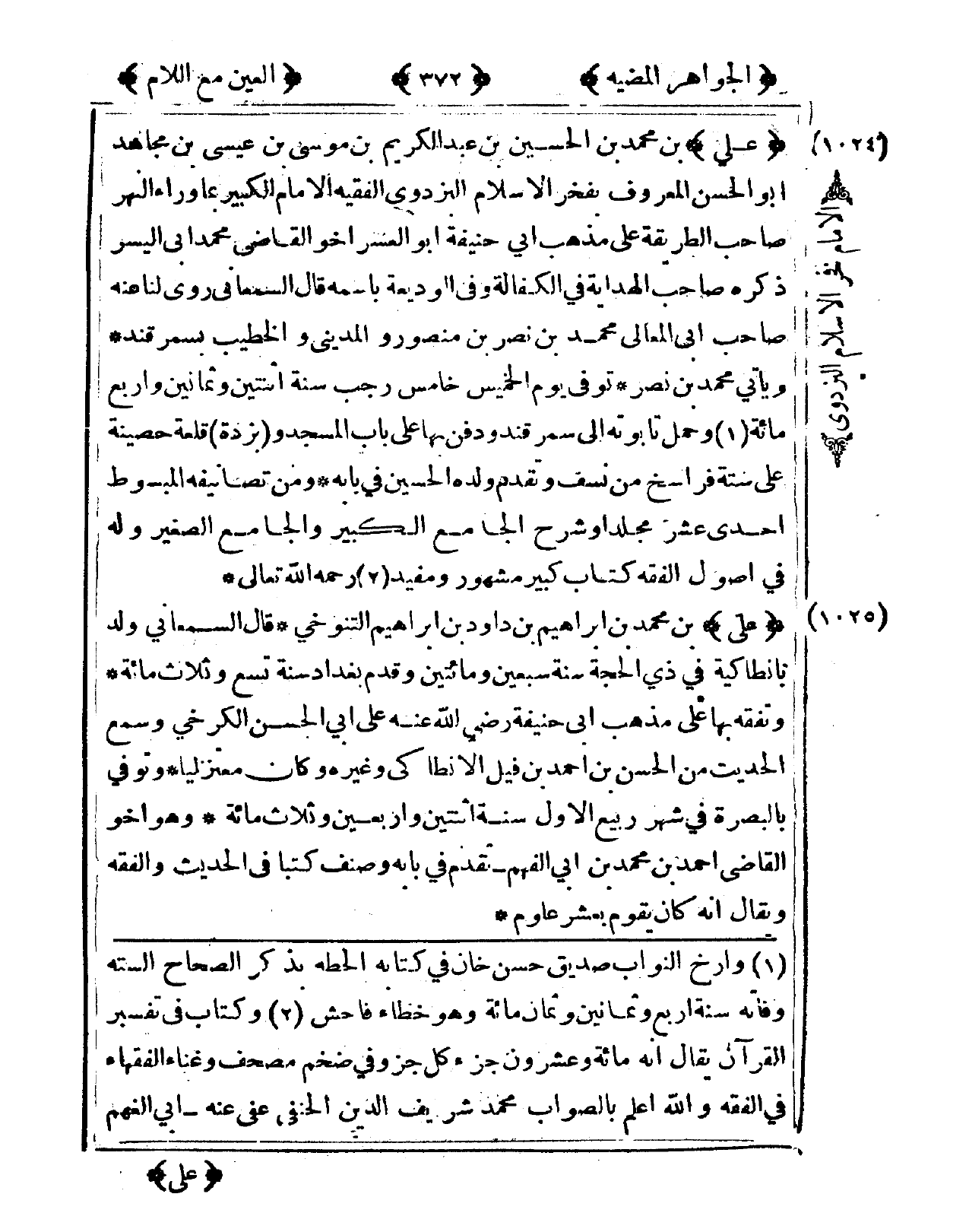 1024 - عَليّ بن مُحَمَّد بن الْحُسَيْن بن عبد الْكَرِيم بن مُوسَى بن عِيسَى بن مُجَاهِد أَبُو الْحسن الْمَعْرُوف بفخر الْإِسْلَام الْبَزْدَوِيّ الْفَقِيه الإِمَام الْكَبِير بِمَا وَرَاء النَّهر صَاحب الطَّرِيقَة على مَذْهَب أبي حنيفَة أَبُو الْعسر أَخُو القَاضِي مُحَمَّد أبي الْيُسْر ذكره صَاحب الْهِدَايَة فى الْكفَالَة وفى الْوَدِيعَة باسمه قَالَ السَّمْعَانِيّ روى لنا عَنهُ صَاحب أبي الْمَعَالِي مُحَمَّد بن نصر بن مَنْصُور الْمَدِينِيّ والخطيب بسمرقند وَيَأْتِي مُحَمَّد بن نصر توفّي يَوْم الْخَمِيس خَامِس رَجَب سنة اثْنَتَيْنِ وَثَمَانِينَ وَأَرْبع مائَة وَحمل تابوته إِلَى سَمَرْقَنْد وَدفن بهَا على بَاب الْمَسْجِد وبزدة قلعة حَصِينَة على سِتَّة فراسخ من نسف وَتقدم وَلَده الْحُسَيْن فى بَابه وَمن تصانيفه الْمَبْسُوط إِحْدَى عشر مجلدا وَشرح الْجَامِع الْكَبِير وَالْجَامِع الصَّغِير وَله فى أصُول الْفِقْه كتاب كَبِير مَشْهُور ومفيد رَحمَه الله تَعَالَى