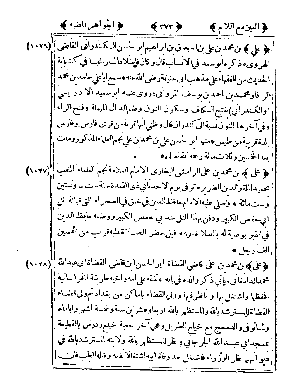 1028 - عَليّ بن مُحَمَّد بن عَليّ قَاضِي الْقُضَاة أَبُو الْحسن ابْن قَاضِي الْقُضَاة أبي عبد الله مُحَمَّد الدَّامغَانِي يَأْتِي ذكر وَالِده فى بَابه تفقه على أمه وأخيه طَريقَة الخراسانية فحفظها واشتغل بهَا وناظر فِيهَا وَولي الْقَضَاء بأماكن من بَغْدَاد ثمَّ ولى قَضَاء الْقُضَاة للمسترشد بِاللَّه والمستظهر بِاللَّه أَرْبعا وَعشْرين سنة وَخَمْسَة أشهر وأياما وَلما توفّي وَالِده حج مَعَ خيلع الطَّوِيل وَهُوَ آخر حجَّة خليع ودرس بالقطيعة بِمَسْجِد أبي عبد الله الْجِرْجَانِيّ وَنظر للمستظهر بِاللَّه ولإبنه المسترشد بِاللَّه فى ديوانهما نظر الوزراء فاشتغل بعد وَفَاة أَبِيه اشتغالا نَفعه وَقَتله الطِّبّ فَإِن