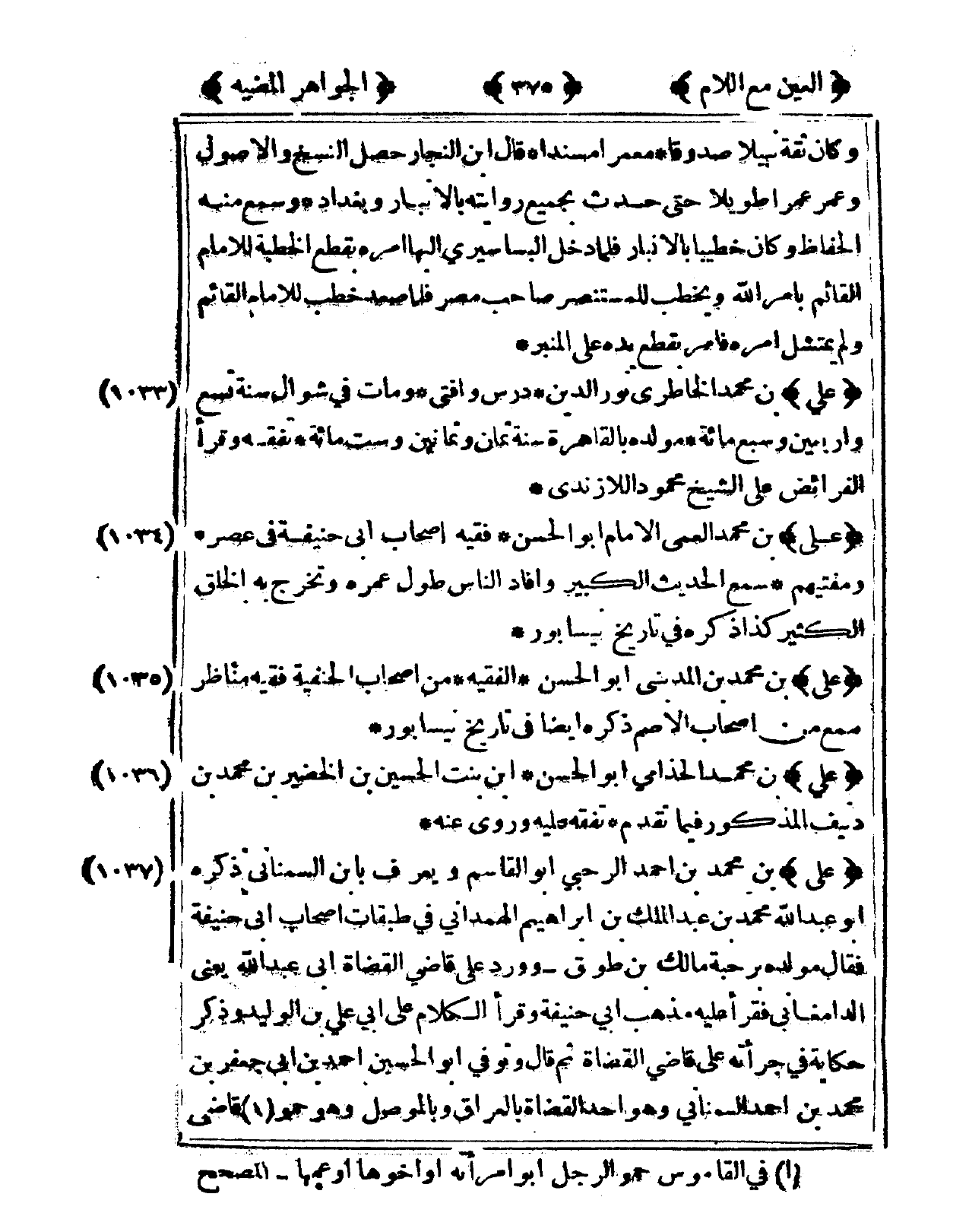 1034 - عَليّ بن مُحَمَّد الْعَمى الإِمَام أَبُو الْحسن فَقِيه أَصْحَاب أبي حنيفَة فى عصره ومفتيهم سمع الحَدِيث الْكَبِير وَأفَاد النَّاس طول عمره وَتخرج بِهِ الْخلق الْكثير كَذَا ذكره فى تَارِيخ نيسابور