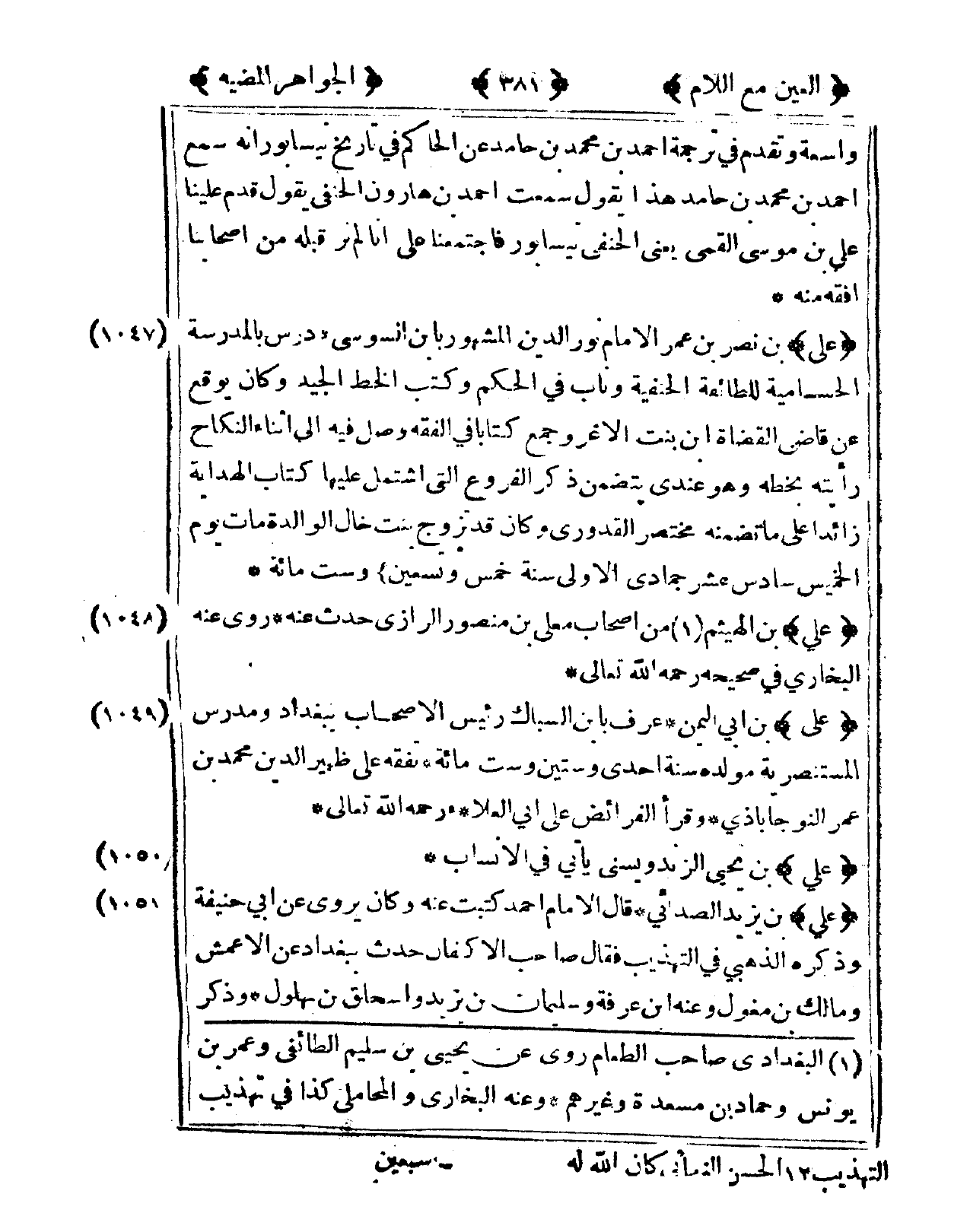 1049 - عَليّ بن أبي الْيمن عرف بِابْن السباك رَئِيس الْأَصْحَاب بِبَغْدَاد ومدرس المستنصرية مولده سنة إِحْدَى وَسِتِّينَ وست مائَة تفقه على ظهير الدّين مُحَمَّد بن عمر النوجاباذي وَقَرَأَ الْفَرَائِض على أبي الْعلَا رَحمَه الله تَعَالَى