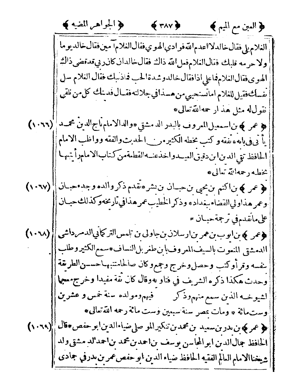 1066 - عمر بن إِسْمَعِيل الْمَعْرُوف بالبدر الدِّمَشْقِي وَالِد الإِمَام تَاج الدّين مُحَمَّد يَأْتِي فى بَابه تفقه وَكتب بِخَطِّهِ الْكثير من الحَدِيث وَالْفِقْه وواظب الإِمَام الْحَافِظ تَقِيّ الدّين ابْن دَقِيق الْعِيد وَأخذ عَنهُ الْقطعَة من كتاب الإِمَام رَأَيْتهَا بِخَطِّهِ رَحمَه الله تَعَالَى