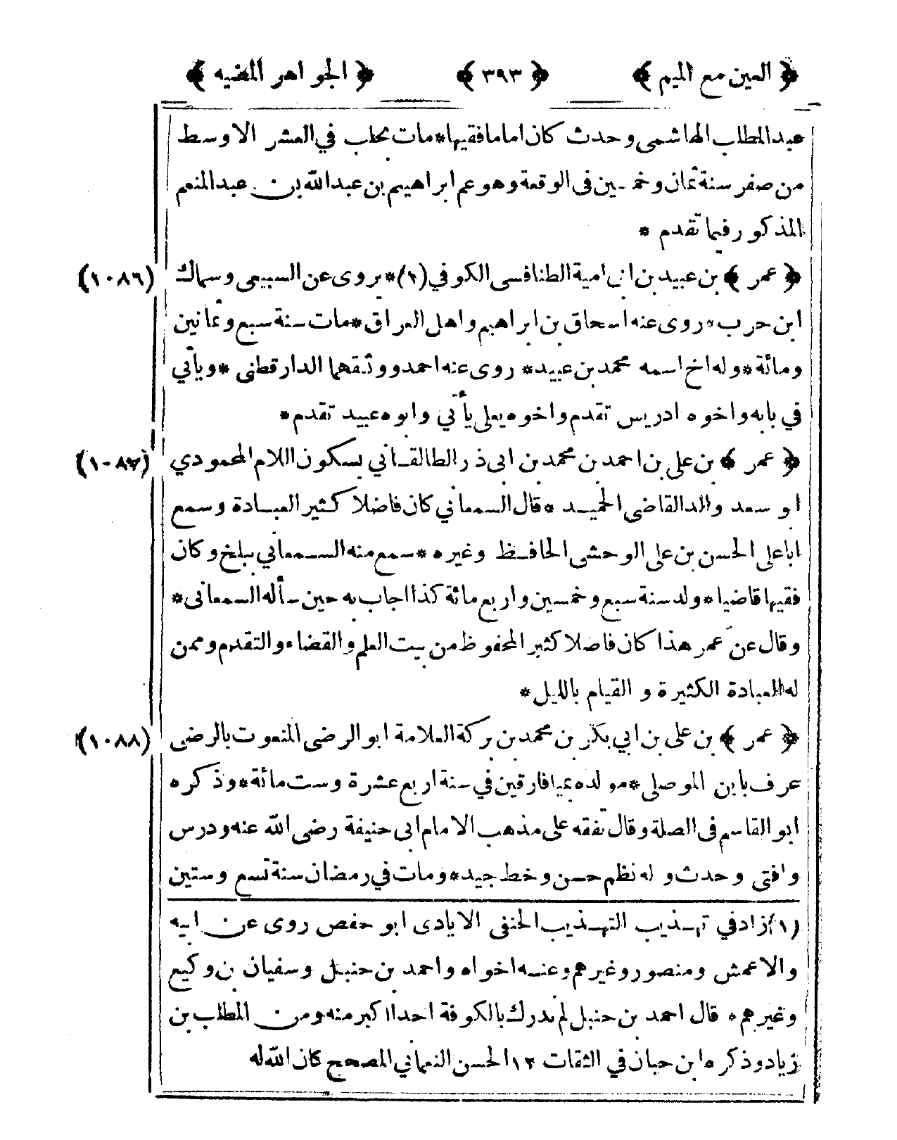 1088 - عمر بن عَليّ بن أبي بكر بن مُحَمَّد بن بركَة الْعَلامَة أَبُو الرضى المنعوت بالرضى عرف بإبن الْموصِلِي مولده بميافارقين فى سنة أَربع عشرَة وست مائَة وَذكره أَبُو الْقَاسِم فى الصِّلَة وَقَالَ تفقه على مَذْهَب الإِمَام أبي حنيفَة رَضِي الله عَنهُ ودرس وَأفْتى وَحدث وَله نظم حسن وَخط جيد وَمَات فى رَمَضَان سنة تسع وَسِتِّينَ