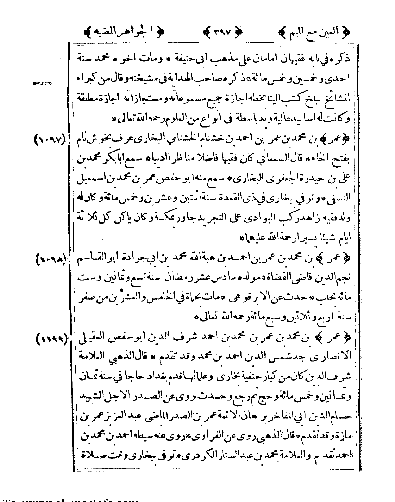 1099 - عمر بن مُحَمَّد بن عمر بن مُحَمَّد بن أَحْمد شرف الدّين أَبُو حَفْص الْعقيلِيّ الْأنْصَارِيّ جد شمس الدّين أَحْمد بن مُحَمَّد وَقد تقدم قَالَ الذَّهَبِيّ الْعَلامَة شرف الدّين كَانَ من كبار حنفية بُخَارى وعلمائها قدم بَغْدَاد حَاجا فى سنة ثَمَان وَثَمَانِينَ وَخمْس مائَة وَحج ثمَّ رَجَعَ وَحدث روى عَن الصَّدْر الْأَجَل الشَّهِيد حسام الدّين أبي المفاخر برهَان الْأَئِمَّة عمر بن الصَّدْر الْمَاضِي عبد الْعَزِيز عمر بن مازة وَقد تقدم قَالَ الذَّهَبِيّ روى عَن الفراوي روى عَنهُ سبطه أَحْمد بن مُحَمَّد بن أَحْمد تقدم والعلامة مُحَمَّد بن عبد الستار الْكرْدِي توفّي ببخارى وَقت صَلَاة
