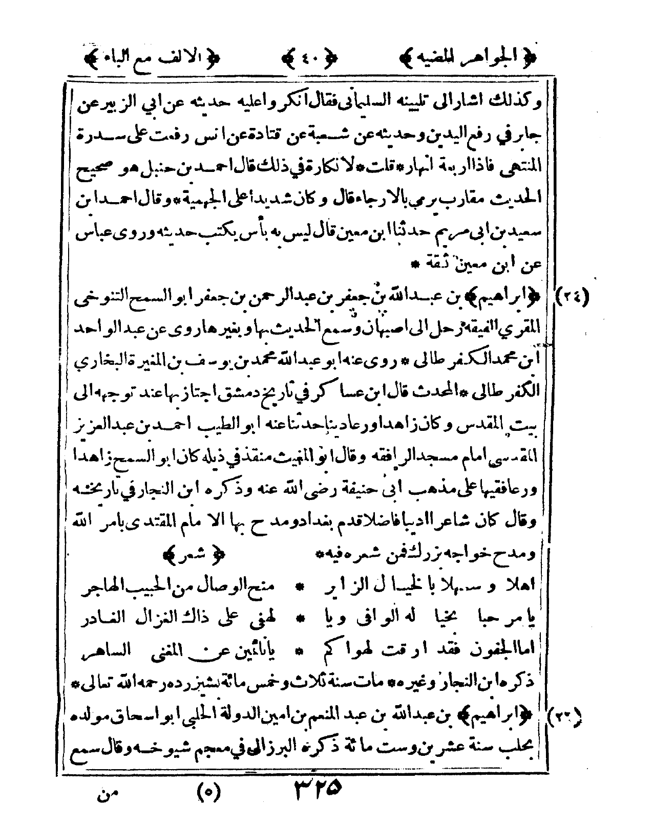 24 - إِبْرَاهِيم بن عبد الله بن جَعْفَر بن عبد الرَّحْمَن بن جَعْفَر أَبُو السَّمْح التنوخي الْمقري الْفَقِيه رَحل إِلَى أَصْبَهَان وَسمع الحَدِيث بهَا وبغيرها رُوِيَ عَن عبد الْوَاحِد ابْن مُحَمَّد الْكفْر طالي روى عَنهُ أَبُو عبد الله مُحَمَّد بن يُوسُف بن الْمُغيرَة البُخَارِيّ الْكفْر طالي الْمُحدث قَالَ ابْن عَسَاكِر فى تَارِيخ دمشق اجتاز بهَا عِنْد توجهه إِلَى بَيت الْمُقَدّس وَكَانَ زاهدا ورعا دينا حَدثنَا عَنهُ أَبُو الطّيب أَحْمد بن عبد الْعَزِيز الْمَقْدِسِي إِمَام مَسْجِد الرافقة وَقَالَ أَبُو المغيث منقذ فى ذيله كَانَ أَبُو السَّمْح زاهدا ورعا فَقِيها على مَذْهَب أَبى حنيفَة رضى الله عَنهُ وَذكره ابْن النجار فى تَارِيخه وَقَالَ كَانَ شَاعِرًا أديبا فَاضلا قدم بَغْدَاد ومدح بهَا الإِمَام الْمُقْتَدِي بِأَمْر الله ومدح خواجه بزرك فَمن شعره فِيهِ شعر ... أَهلا وسهلا بالخيال الزاير ... منح الْوِصَال من الحبيب الهاجر