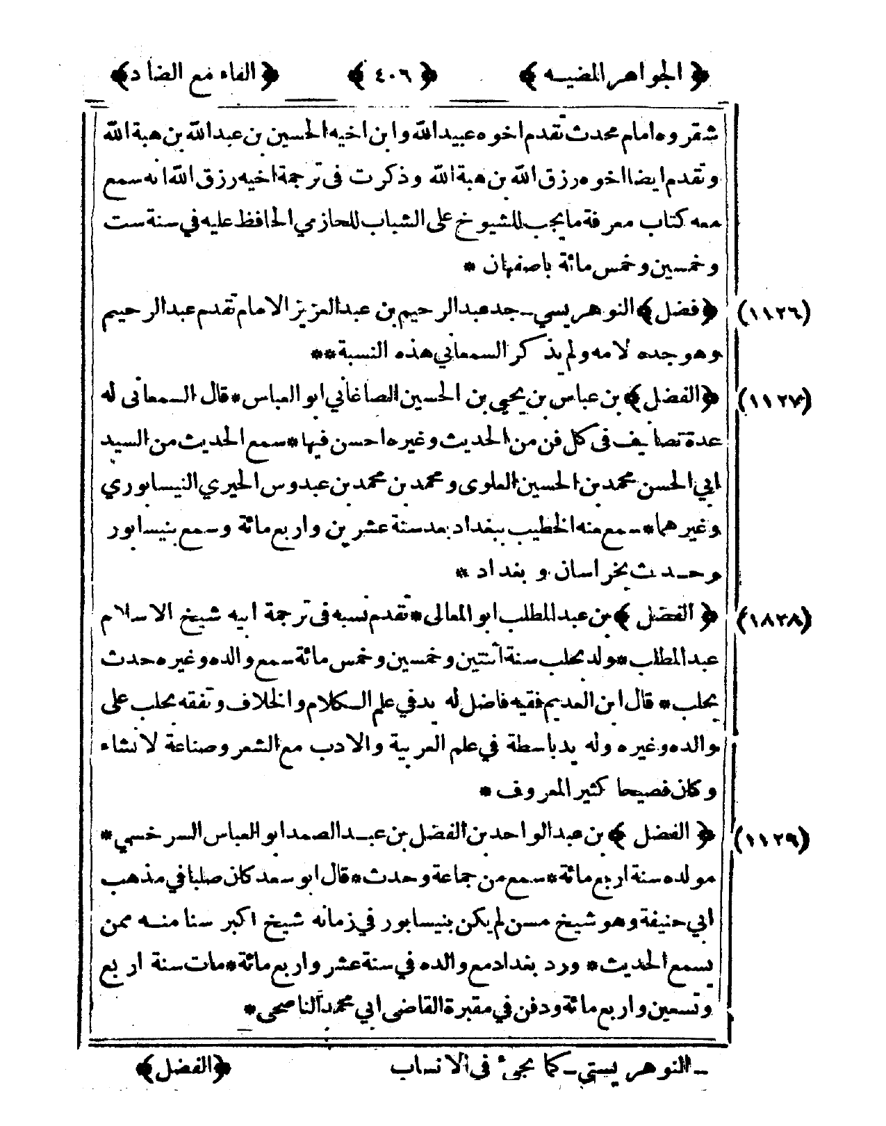 1129 - الْفضل بن عبد الْوَاحِد بن الْفضل بن عبد الصَّمد أَبُو الْعَبَّاس السَّرخسِيّ مولده سنة أَربع مائَة سمع من جمَاعَة وَحدث قَالَ أَبُو سعد كَانَ صلبا فى مَذْهَب أبي حنيفَة وَهُوَ شيخ مسن لم يكن بنيسابور فى زَمَانه شيخ أكبر سنا مِنْهُ مِمَّن يسمع الحَدِيث ورد بَغْدَاد مَعَ وَالِده فى سنة عشر وَأَرْبع مائَة مَاتَ سنة أَربع وَتِسْعين وَأَرْبع مائَة وَدفن فى مَقْبرَة القَاضِي أبي مُحَمَّد الناصحي