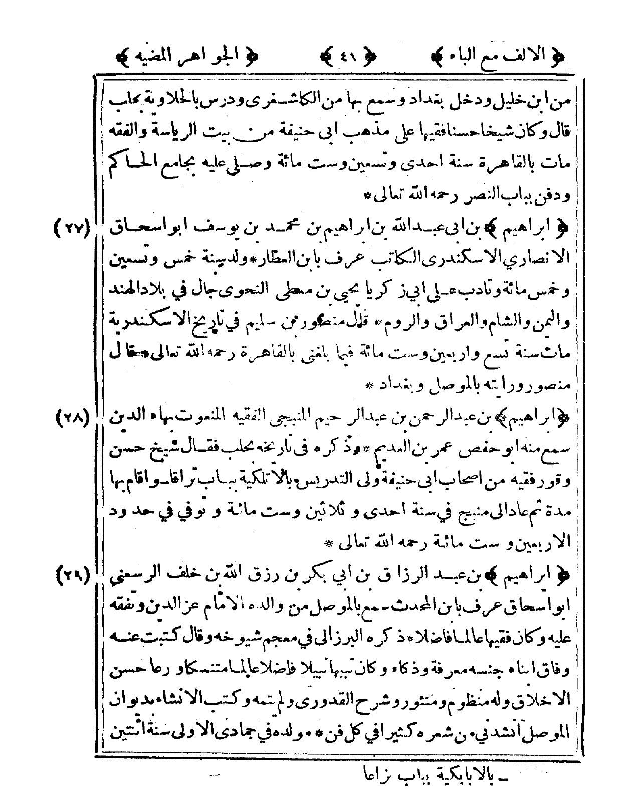 28 - إِبْرَهِيمُ بن عبد الرَّحْمَن بن عبد الرَّحِيم المنبجي الْفَقِيه المنعوت بهاء الدّين سمع مِنْهُ أَبُو حَفْص عمر بن العديم وَذكره فى تَارِيخه بحلب فَقَالَ شيخ حسن وقور فَقِيه من أَصْحَاب أبي حنيفَة ولى التدريس بالأتلكية بِبَاب تراقا وَأقَام بهَا مُدَّة ثمَّ عَاد إِلَى منبج فى سنة إِحْدَى وَثَلَاثِينَ وست مائَة وَتُوفِّي فى حُدُود الْأَرْبَعين وست مائَة رَحمَه الله تَعَالَى