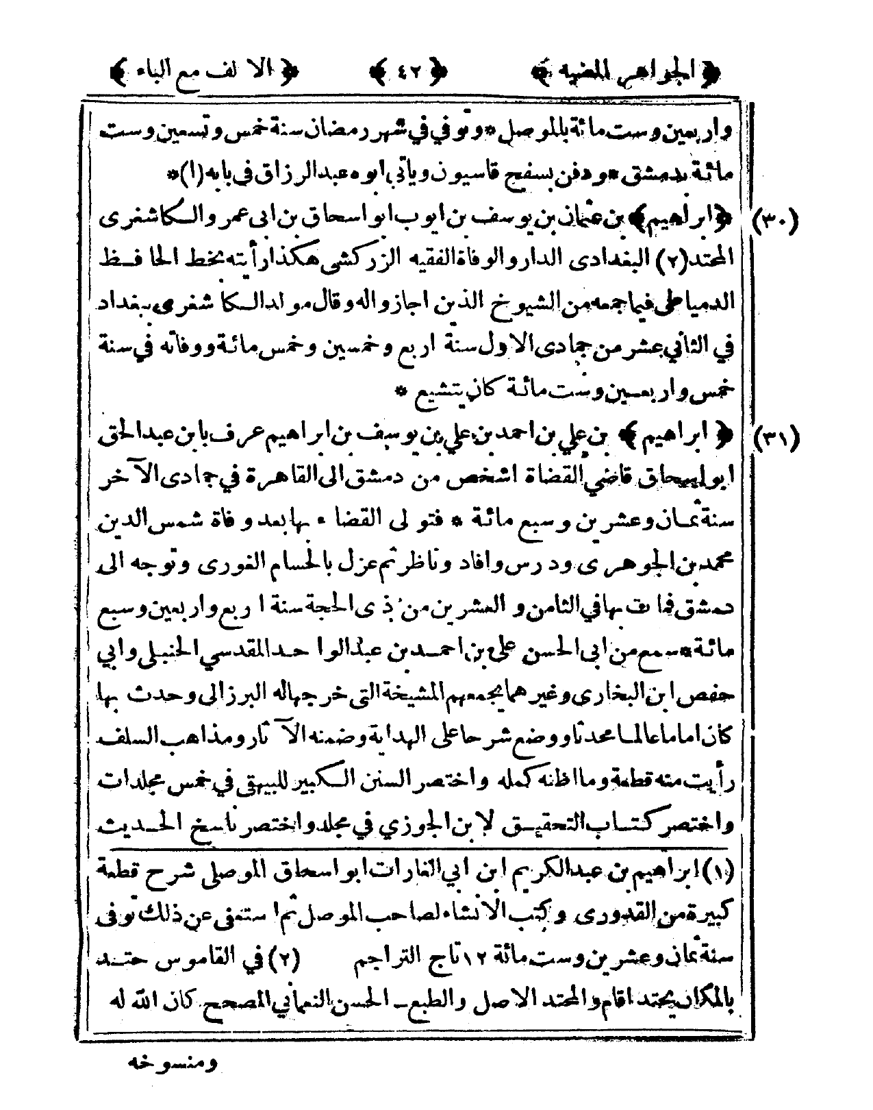 30 - إِبْرَاهِيم بن عُثْمَان بن يُوسُف بن أَيُّوب أَبُو إِسْحَاق بن أبي عَمْرو الكاشغري المحتد الْبَغْدَادِيّ الدَّار والوفاة الْفَقِيه الزَّرْكَشِيّ هَكَذَا رَأَيْته بِخَط الْحَافِظ الدمياطي فِيمَا جمعه من الشُّيُوخ الَّذين أَجَازُوا لَهُ وَقَالَ مولد الكاشغري بِبَغْدَاد فى الثَّانِي عشر من جمادي الأول سنة أَربع وَخمسين وَخمْس مائَة ووفاته فى سنة خمس وَأَرْبَعين وست مائَة كَانَ يتشيع