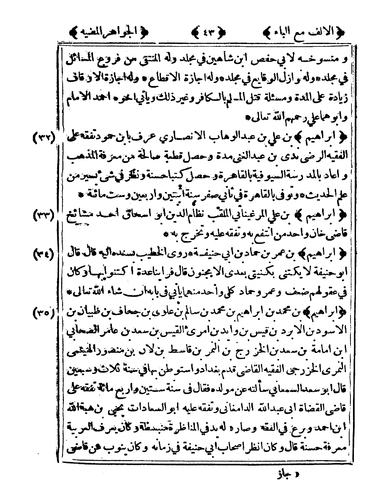 33 - إِبْرَاهِيم بن عَليّ المرغيناني الملقب نظام الدّين أَبُو إِسْحَاق أحد مشائخ قَاضِي خَان وَاحِد من انْتفع بِهِ وتفقه عَلَيْهِ وَتخرج بِهِ