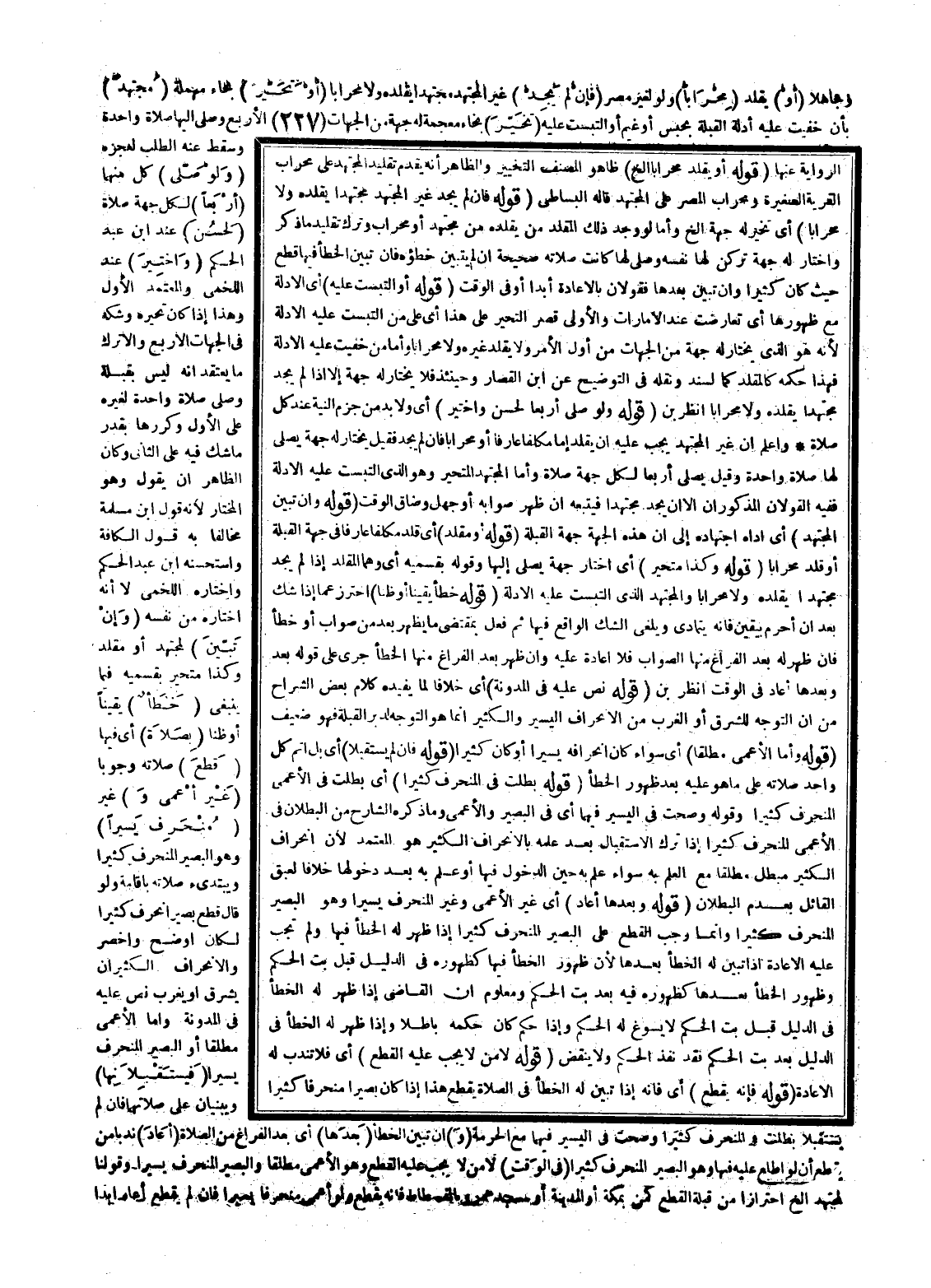 وَجَاهِلًا (أَوْ) يُقَلِّدُ (مِحْرَابًا) وَلَوْ لِغَيْرِ مِصْرٍ (فَإِنْ لَمْ يَجِدْ) غَيْرُ الْمُجْتَهِدِ مُجْتَهِدًا يُقَلِّدُهُ وَلَا مِحْرَابًا (أَوْ) (تَحَيَّرَ) بِحَاءٍ مُهْمَلَةٍ (مُجْتَهِدٌ) بِأَنْ خَفِيَتْ عَلَيْهِ أَدِلَّةُ الْقِبْلَةِ بِحَبْسٍ أَوْ غَيْمٍ أَوْ الْتَبَسَتْ عَلَيْهِ (تَخَيَّرَ) بِخَاءٍ مُعْجَمَةٍ لَهُ جِهَةً مِنْ الْجِهَاتِ الْأَرْبَعِ وَصَلَّى إلَيْهَا صَلَاةً وَاحِدَةً وَسَقَطَ عَنْهُ الطَّلَبُ لِعَجْزِهِ (وَلَوْ صَلَّى) كُلٌّ مِنْهُمَا (أَرْبَعًا) لِكُلِّ جِهَةٍ صَلَاةً (لَحَسُنَ) عِنْدَ ابْنِ عَبْدِ الْحَكَمِ (وَاخْتِيرَ) عِنْدَ اللَّخْمِيِّ وَالْمُعْتَمَدُ الْأَوَّلُ وَهَذَا إذَا كَانَ تَحَيُّرُهُ وَشَكُّهُ فِي الْجِهَاتِ الْأَرْبَعِ وَإِلَّا تَرَكَ مَا يَعْتَقِدُ أَنَّهُ لَيْسَ بِقِبْلَةٍ وَصَلَّى صَلَاةً وَاحِدَةً لِغَيْرِهِ عَلَى الْأَوَّلِ وَكَرَّرَهَا بِقَدْرِ مَا شَكَّ فِيهِ عَلَى الثَّانِي وَكَانَ الظَّاهِرُ أَنْ يَقُولَ وَهُوَ الْمُخْتَارُ لِأَنَّهُ قَوْلُ ابْنِ مَسْلَمَةَ مُخَالِفًا بِهِ قَوْلَ الْكَافَّةِ وَاسْتَحْسَنَهُ ابْنُ عَبْدِ الْحَكَمِ وَاخْتَارَهُ اللَّخْمِيُّ لَا أَنَّهُ اخْتَارَهُ مِنْ نَفْسِهِ (وَإِنْ تَبَيَّنَ) لِمُجْتَهِدٍ أَوْ مُقَلِّدٍ وَكَذَا مُتَحَيِّرٍ بِقِسْمَيْهِ فِيمَا يَنْبَغِي (خَطَأٌ) يَقِينًا أَوْ ظَنًّا (بِصَلَاةٍ) أَيْ فِيهَا (قَطَعَ) صَلَاتَهُ وُجُوبًا (غَيْرَ أَعْمَى وَ) غَيْرَ (مُنْحَرِفٍ يَسِيرًا) وَهُوَ الْبَصِيرُ الْمُنْحَرِفُ كَثِيرًا وَيَبْتَدِئُ صَلَاتَهُ بِإِقَامَةٍ وَلَوْ قَالَ قَطَعَ بَصِيرٌ انْحَرَفَ كَثِيرًا لَكَانَ أَوْضَحَ وَأَخْصَرَ وَالِانْحِرَافُ الْكَثِيرُ أَنْ يُشَرِّقَ أَوْ يُغَرِّبَ نَصَّ عَلَيْهِ فِي الْمُدَوَّنَةِ وَأَمَّا الْأَعْمَى مُطْلَقًا أَوْ الْبَصِيرُ الْمُنْحَرِفُ يَسِيرًا (فَيَسْتَقْبِلَانِهِ ا) وَيَبْنِيَانِ عَلَى صَلَاتِهِمَا فَإِنْ لَمْ يَسْتَقْبِلَا بَطَلَتْ فِي الْمُنْحَرِفِ كَثِيرًا وَصَحَّتْ فِي الْيَسِيرِ فِيهِمَا مَعَ الْحُرْمَةِ (وَ) إنْ تَبَيَّنَ الْخَطَأُ (بَعْدَهَا) أَيْ بَعْدَ الْفَرَاغِ مِنْ الصَّلَاةِ (أَعَادَ) نَدْبًا مَنْ يَقْطَعُ أَنْ لَوْ اطَّلَعَ عَلَيْهِ فِيهَا وَهُوَ الْبَصِيرُ الْمُنْحَرِفُ كَثِيرًا (فِي الْوَقْتِ) لَا مَنْ لَا يَجِبُ عَلَيْهِ الْقَطْعُ وَهُوَ الْأَعْمَى مُطْلَقًا وَالْبَصِيرُ الْمُنْحَرِفُ يَسِيرًا وَقَوْلُنَا لِمُجْتَهِدٍ إلَخْ احْتِرَازًا مِنْ قِبْلَةِ الْقَطْعِ كَمَنْ بِمَكَّةَ أَوْ الْمَدِينَةِ أَوْ بِمَسْجِدِ عَمْرٍو بِالْفُسْطَاطِ فَإِنَّهُ يَقْطَعُ وَلَوْ أَعْمَى مُنْحَرِفًا يَسِيرًا فَإِنْ لَمْ يَقْطَعْ أَعَادَ أَبَدًا