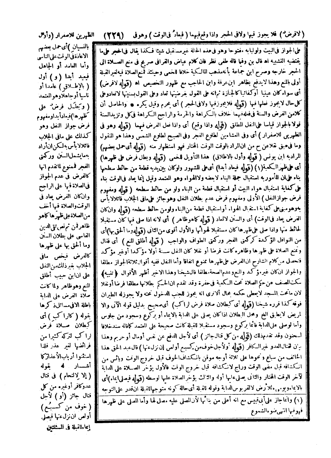 (قَوْلُهُ: لَا فَرْضٍ) أَيْ سَوَاءً كَانَ عَيْنِيًّا أَوْ كِفَائِيًّا كَالْجِنَازَةِ ثُمَّ إنَّهُ عَلَى الْقَوْلِ بِفَرْضِيَّتِهَا تُعَادُ وَعَلَى الْقَوْلِ بِسُنِّيَّتِهَا لَا تُعَادُ وَعَلَى كُلِّ حَالٍ لَا يَجُوزُ فِعْلُهَا فِيهَا (قَوْلُهُ: فَلَا يَجُوزُ فِيهَا وَلَا فِي الْحِجْرِ) أَيْ يَحْرُمُ وَقِيلَ يُكْرَهُ. وَالْحَاصِلُ أَنَّ كُلًّا مِنْ الْفَرْضِ وَالسُّنَّةِ فِي فِعْلِهِ فِيهِمَا خِلَافٌ بِالْكَرَاهَةِ وَالْحُرْمَةِ وَالرَّاجِحُ الْكَرَاهَةُ فِي كُلٍّ وَتَزِيدُ السُّنَّةُ قَوْلًا بِالْجَوَازِ قِيَاسًا عَلَى النَّفْلِ الْمُطْلَقِ (قَوْلُهُ: وَإِذَا وَقَعَ) أَيْ وَإِذَا فُعِلَ الْفَرْضُ فِيهِمَا (قَوْلُهُ: وَهُوَ فِي الظُّهْرَيْنِ لِلِاصْفِرَارِ) أَيْ وَفِي الْعِشَاءَيْنِ لِطُلُوعِ الْفَجْرِ وَفِي الصُّبْحِ لِطُلُوعِ الشَّمْسِ وَهَذَا هُوَ الْمَنْقُولُ وَمَا فِي عبق نَقْلًا عَنْ ح مِنْ أَنَّ الْمُرَادَ بِالْوَقْتِ الْوَقْتُ الْمُخْتَارُ فَهُوَ اسْتِظْهَارٌ مِنْهُ (قَوْلُهُ: أَيْ حَمَلَ بَعْضُهُمْ) الْمُرَادُ بِهِ ابْنُ يُونُسَ (قَوْلُهُ: وَأُوِّلَ بِالْإِطْلَاقِ) هَذَا التَّأْوِيلُ لِلَّخْمِيِّ.