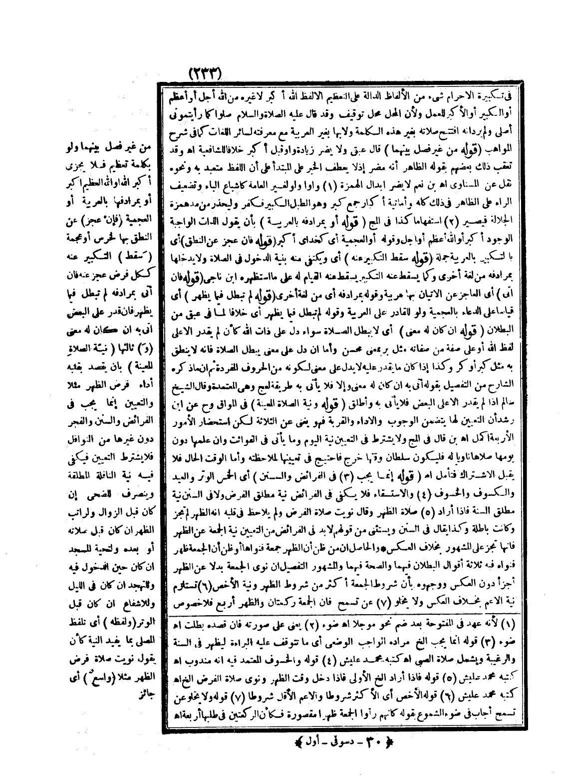 (قَوْلُهُ: مِنْ غَيْرِ فَصْلٍ بَيْنَهُمَا) قَالَ عبق وَلَا يَضُرُّ زِيَادَةُ وَاوٍ قَبْلَ أَكْبَرُ خِلَافًا لِلشَّافِعِيَّةِ اهـ وَقَدْ تَعَقَّبَ ذَلِكَ بَعْضُهُمْ بِقَوْلِهِ الظَّاهِرُ أَنَّهُ مُضِرٌّ إذْ لَا يُعْطَفُ الْخَبَرُ عَلَى الْمُبْتَدَأِ عَلَى أَنَّ اللَّفْظَ مُتَعَبَّدٌ بِهِ وَنَحْوُهُ نُقِلَ عَنْ الْمِسْنَاوِيِّ اهـ بْن نَعَمْ لَا يَضُرُّ إبْدَالُ الْهَمْزَةِ وَاوًا وَلَوْ لِغَيْرِ الْعَامَّةِ كَإِشْبَاعِ الْبَاءِ وَتَضْعِيفِ الرَّاءِ عَلَى الظَّاهِرِ فِي ذَلِكَ كُلِّهِ وَأَمَّا نِيَّةُ أَكْبَارٍ جَمْعِ كُبَرٍ وَهُوَ الطَّبْلُ الْكَبِيرُ فَكُفْرٌ وَلْيُحْذَرْ مِنْ مَدِّ هَمْزَةِ الْجَلَالَةِ فَيَصِيرُ اسْتِفْهَامًا كَذَا فِي المج (قَوْلُهُ: أَوْ بِمُرَادِفِهِ بِالْعَرَبِيَّةِ) بِأَنْ يَقُولَ الذَّاتُ الْوَاجِبَةُ الْوُجُودُ أَكْبَرُ أَوْ اللَّهُ أَعْظَمُ أَوْ أَجَلُّ وَقَوْلُهُ: أَوْ الْعَجَمِيَّةُ أَيْ كخداي أَكْبَرُ (قَوْلُهُ: فَإِنْ عَجَزَ عَنْ النُّطْقِ) أَيْ بِالتَّكْبِيرِ بِالْعَرَبِيَّةِ جُمْلَةً (قَوْلُهُ: سَقَطَ التَّكْبِيرُ عَنْهُ) أَيْ وَيُكْتَفَى مِنْهُ بِنِيَّةِ الدُّخُولِ فِي الصَّلَاةِ وَلَا يَدْخُلُهَا بِمُرَادِفِهِ مِنْ لُغَةٍ أُخْرَى وَكَمَا يَسْقُطُ عَنْهُ التَّكْبِيرُ يَسْقُطُ عَنْهُ الْقِيَامُ لَهُ عَلَى مَا اسْتَظْهَرَهُ ابْنُ نَاجِيٍّ (قَوْلُهُ: فَإِنْ أَتَى) أَيْ الْعَاجِزُ عَنْ الْإِتْيَانِ بِهَا عَرَبِيَّةً وَقَوْلُهُ: بِمُرَادِفِهِ أَيْ مِنْ لُغَةٍ أُخْرَى (قَوْلُهُ: لَمْ تَبْطُلْ فِيمَا يَظْهَرُ) أَيْ قِيَاسًا عَلَى الدُّعَاءِ بِالْعَجَمِيَّةِ وَلَوْ لِلْقَادِرِ عَلَى الْعَرَبِيَّةِ وَقَوْلُهُ: لَمْ تَبْطُلْ فِيمَا يَظْهَرُ أَيْ خِلَافًا لِمَا فِي عبق مِنْ الْبُطْلَانِ (قَوْلُهُ: إنْ كَانَ لَهُ مَعْنًى) أَيْ لَا يُبْطِلُ الصَّلَاةَ سَوَاءً دَلَّ عَلَى ذَاتِ اللَّهِ كَأَنْ لَمْ يَقْدِرْ إلَّا عَلَى لَفْظِ اللَّهِ أَوْ عَلَى صِفَةٍ مِنْ صِفَاتِهِ مِثْلِ بَرٍّ بِمَعْنَى مُحْسِنٍ وَأَمَّا إنْ دَلَّ عَلَى مَعْنًى يُبْطِلُ الصَّلَاةَ فَإِنَّهُ لَا يَنْطِقُ بِهِ مِثْلِ كبر أَوْ كر وَكَذَا إذَا كَانَ مَا يَقْدِرُ عَلَيْهِ لَا يَدُلُّ عَلَى مَعْنًى لِكَوْنِهِ مِنْ الْحُرُوفِ الْمُفْرَدَةِ ثُمَّ إنَّ مَا ذَكَرَهُ الشَّارِحُ مِنْ التَّفْصِيلِ بِقَوْلِهِ أَتَى بِهِ إنْ كَانَ لَهُ مَعْنًى وَإِلَّا فَلَا يَأْتِي بِهِ طَرِيقَةٌ لعج وَهِيَ الْمُعْتَمَدَةُ وَقَالَ الشَّيْخُ سَالِمٌ إذَا لَمْ يَقْدِرْ إلَّا عَلَى الْبَعْضِ فَلَا يَأْتِي بِهِ وَأَطْلَقَ.
